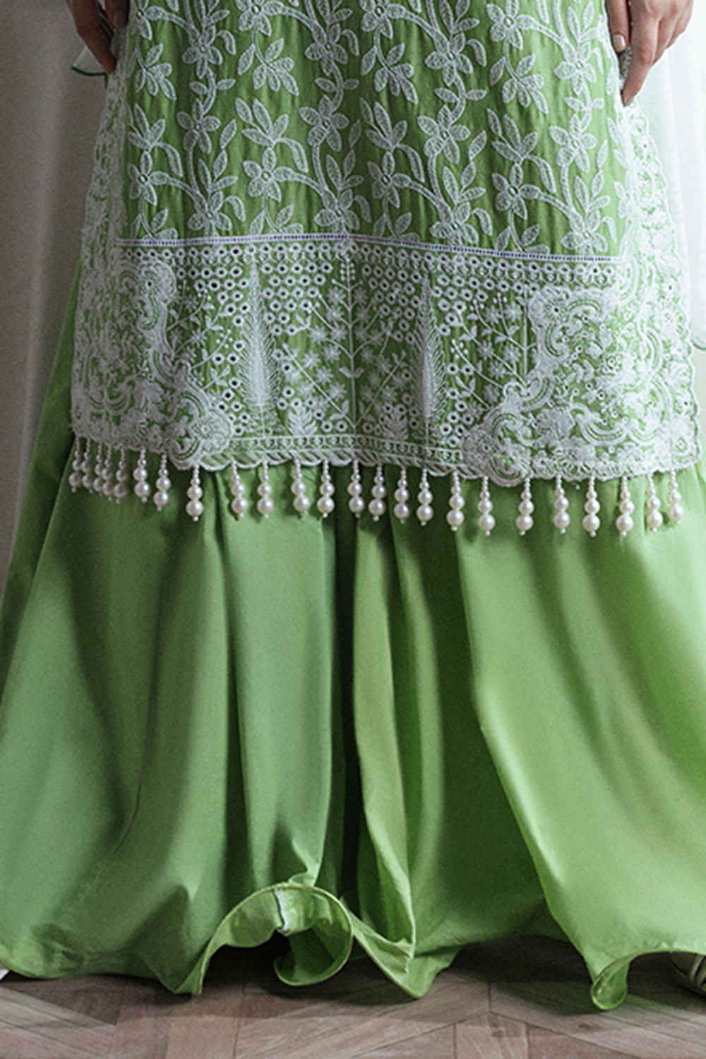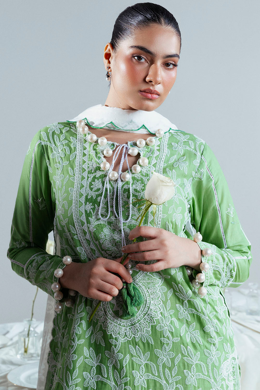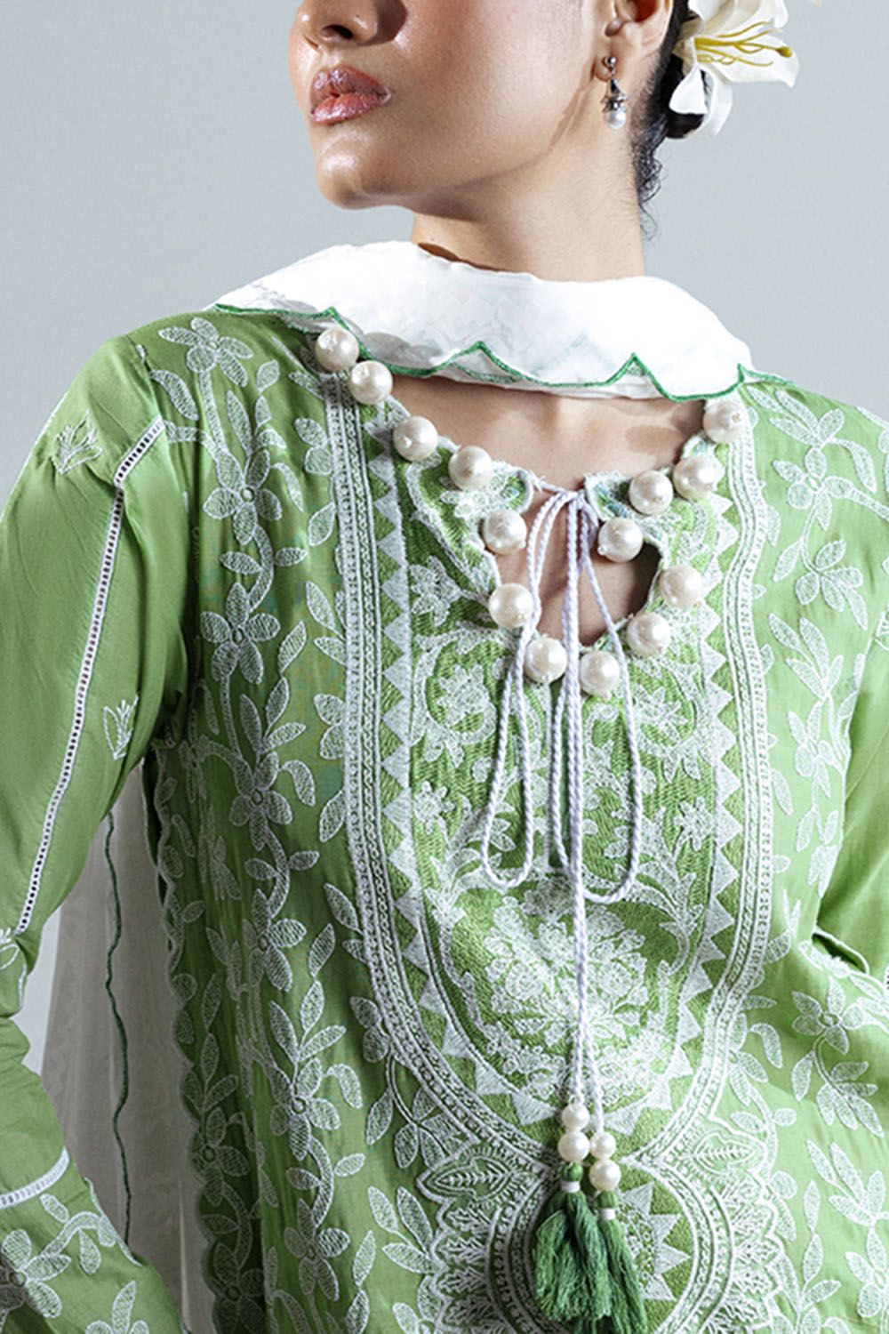 • Embroidered Lawn Shirt Front, Back and Sleeves with Embroidered Neckline, Side Bunches for Front on Organza - 3 Meters