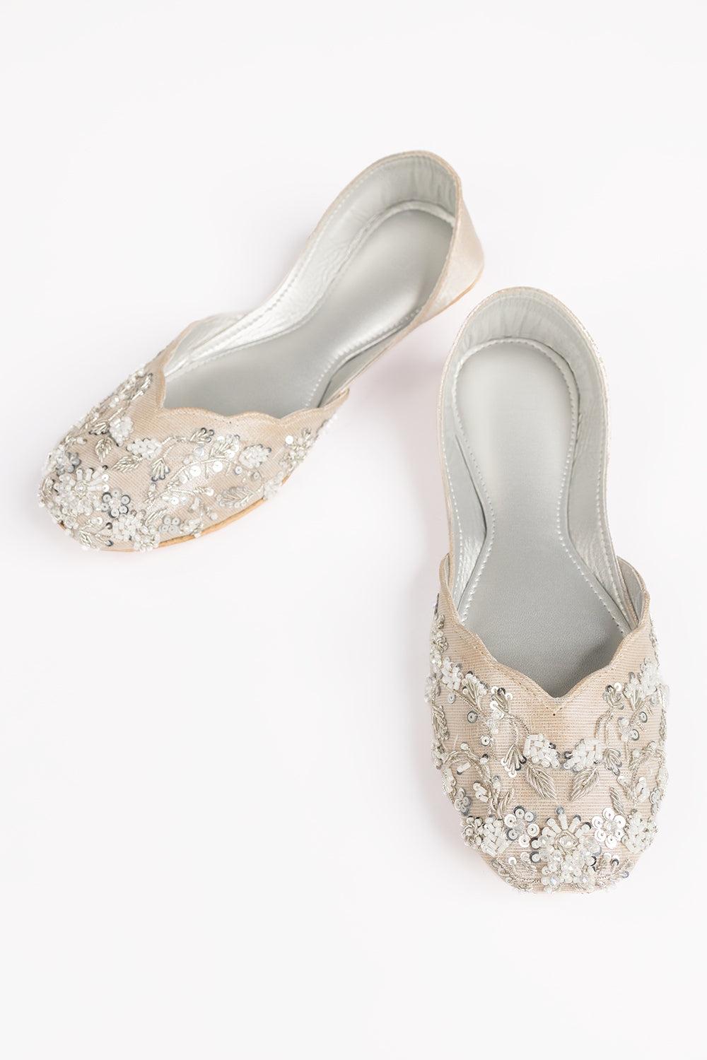 Luxurious silver hand-embroidered Khussa, designed for elegance and all-day comfort. Featuring intricate craftsmanship on the upper and full cushioning for a soft, supportive fit���perfect for festive occasions and traditional wear
