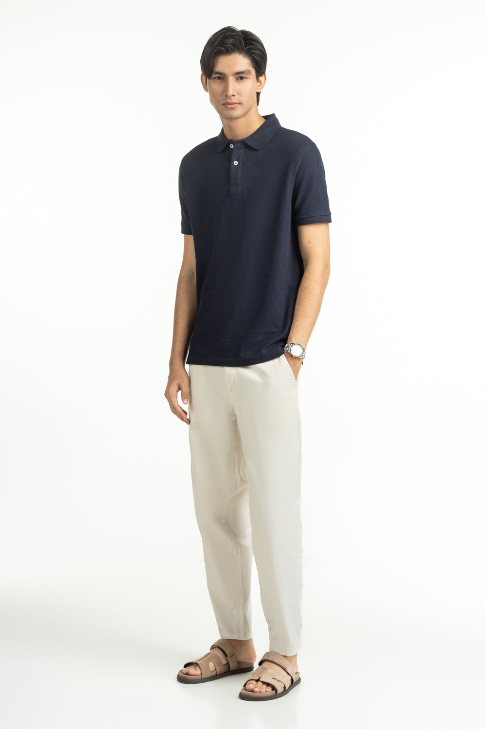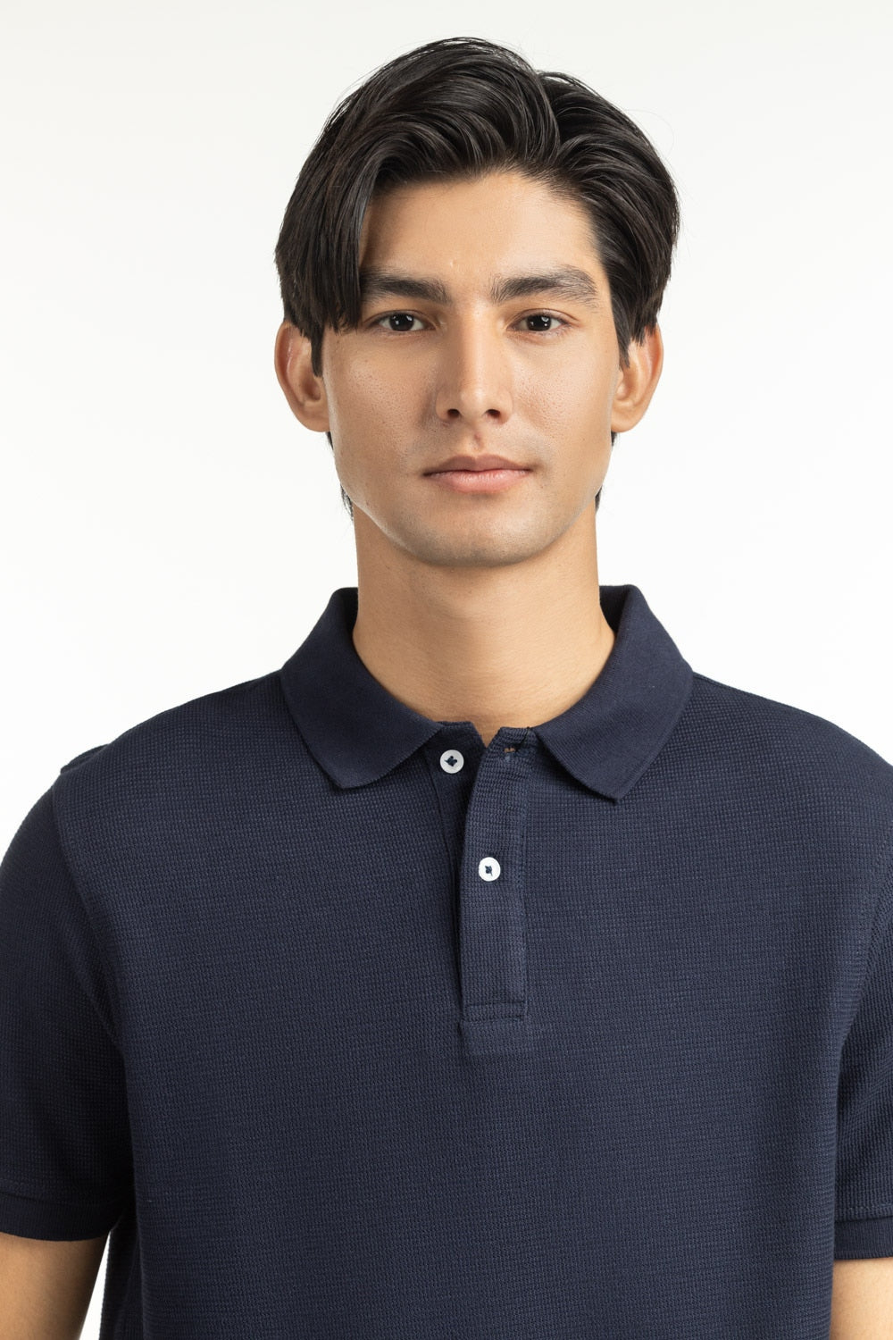 A textured knit brings quiet depth to the classic navy polo, giving it a tactile richness. The regular fit keeps the silhouette sharp yet easy to wear, while lightweight breathability makes it perfect for warm days.