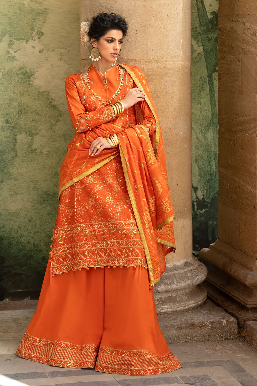 UAE-3 Piece Zari & Sequins Embroidered Lawn Suit with Gold & Lacquer Printed Dupatta DN-52041