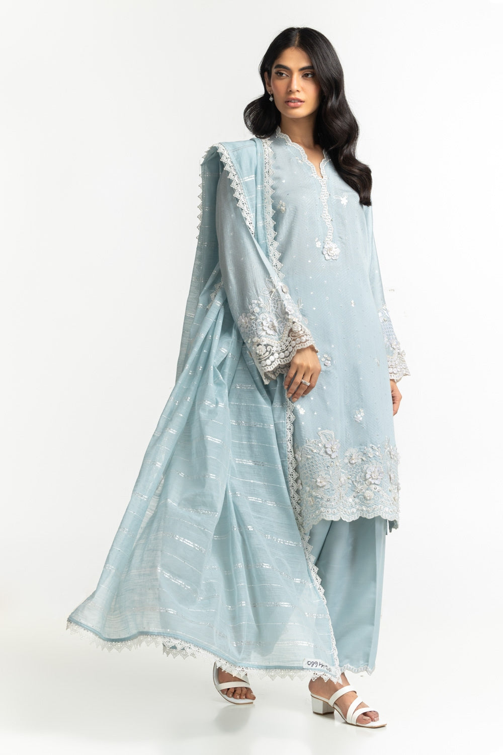 This stunning dupatta features a scattering of shimmering sequins, creating lively and festive aesthetics. The breathable cotton fabric and the soft blue hue makes it a perfect choice this summer.