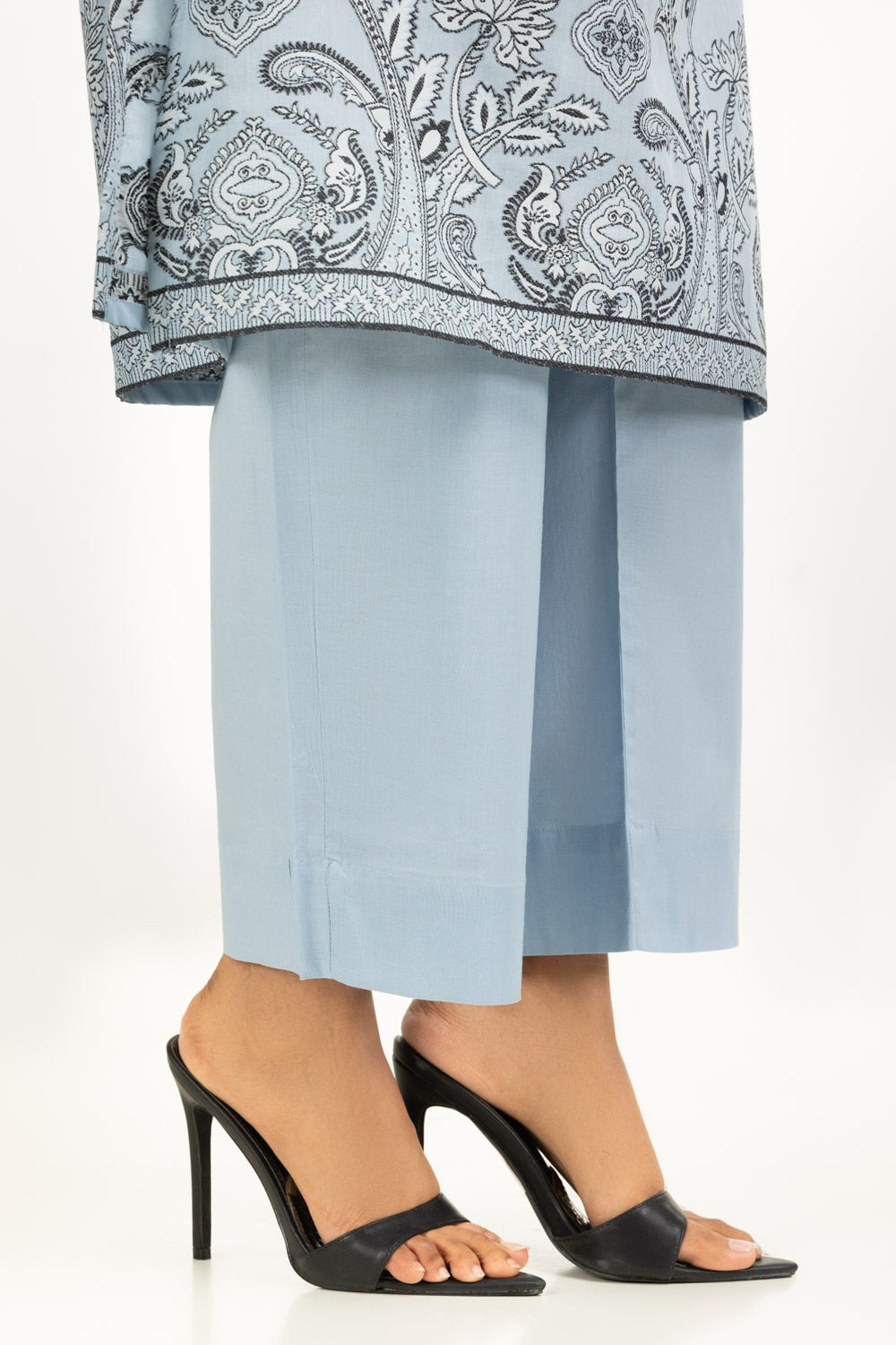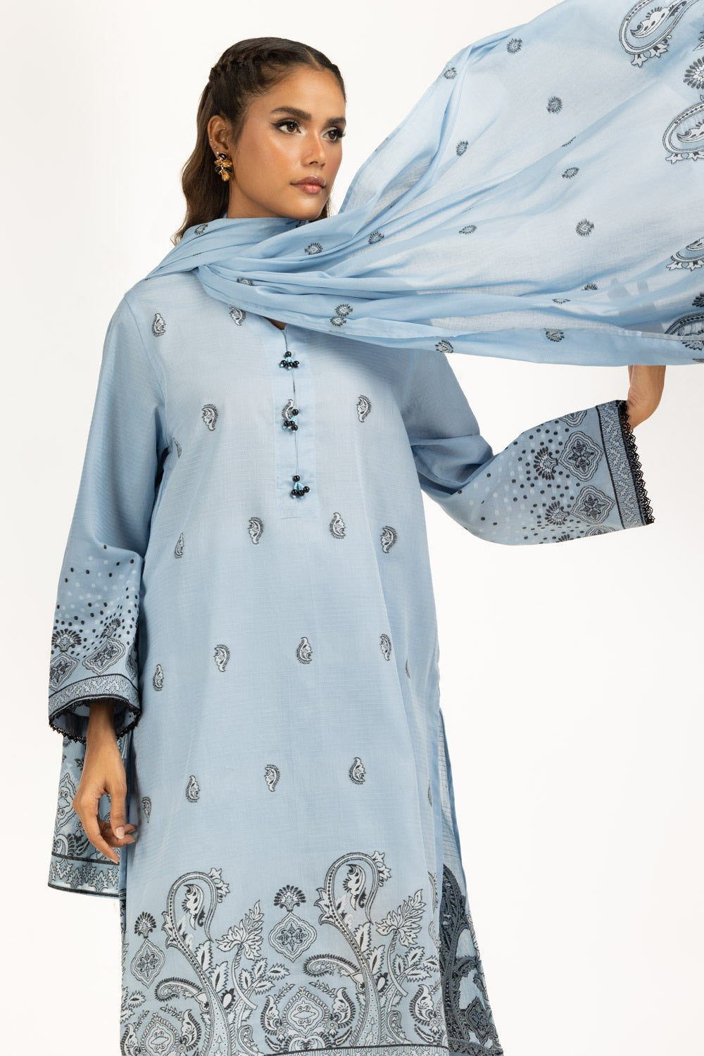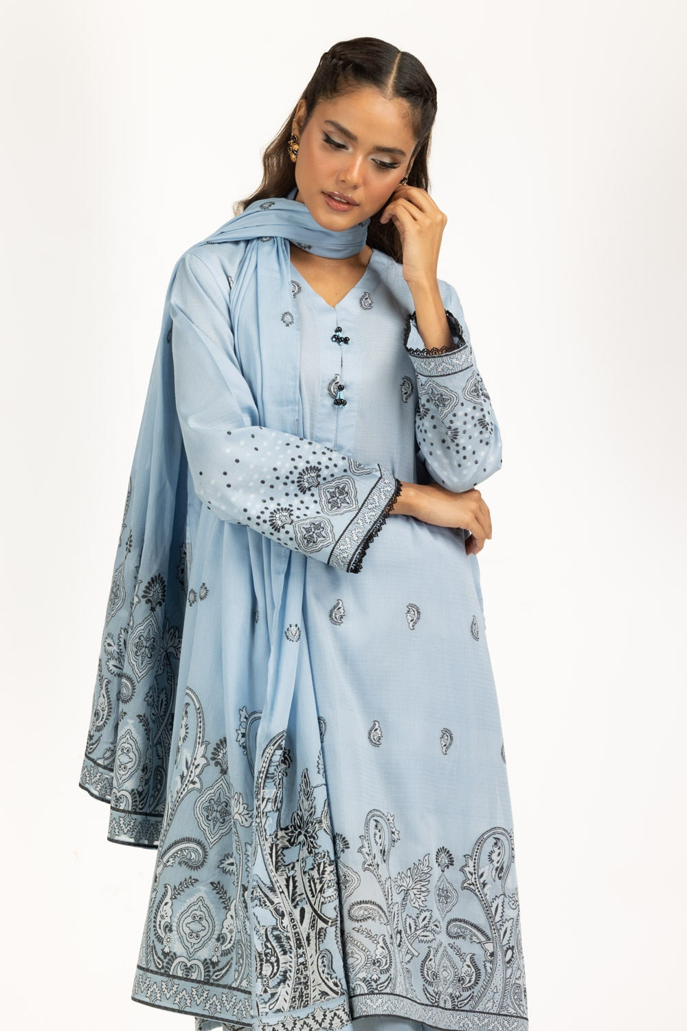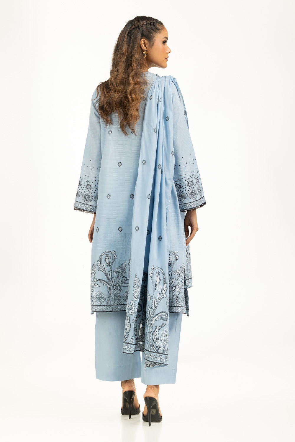 In a soft ice blue hue, this jacquard set strikes the perfect balance between lightness and refinement. The printed shirt and dupatta bring traditional art, while the plain dyed trouser completes the look with quiet elegance. Its loose silhouette flows with ease, making it an effortless choice for long summer days.