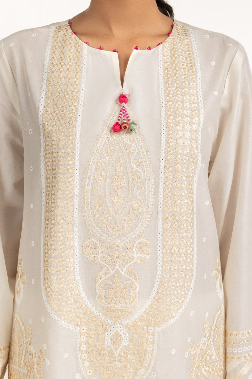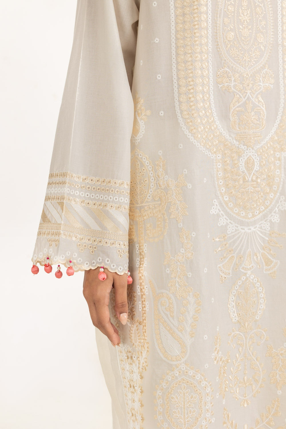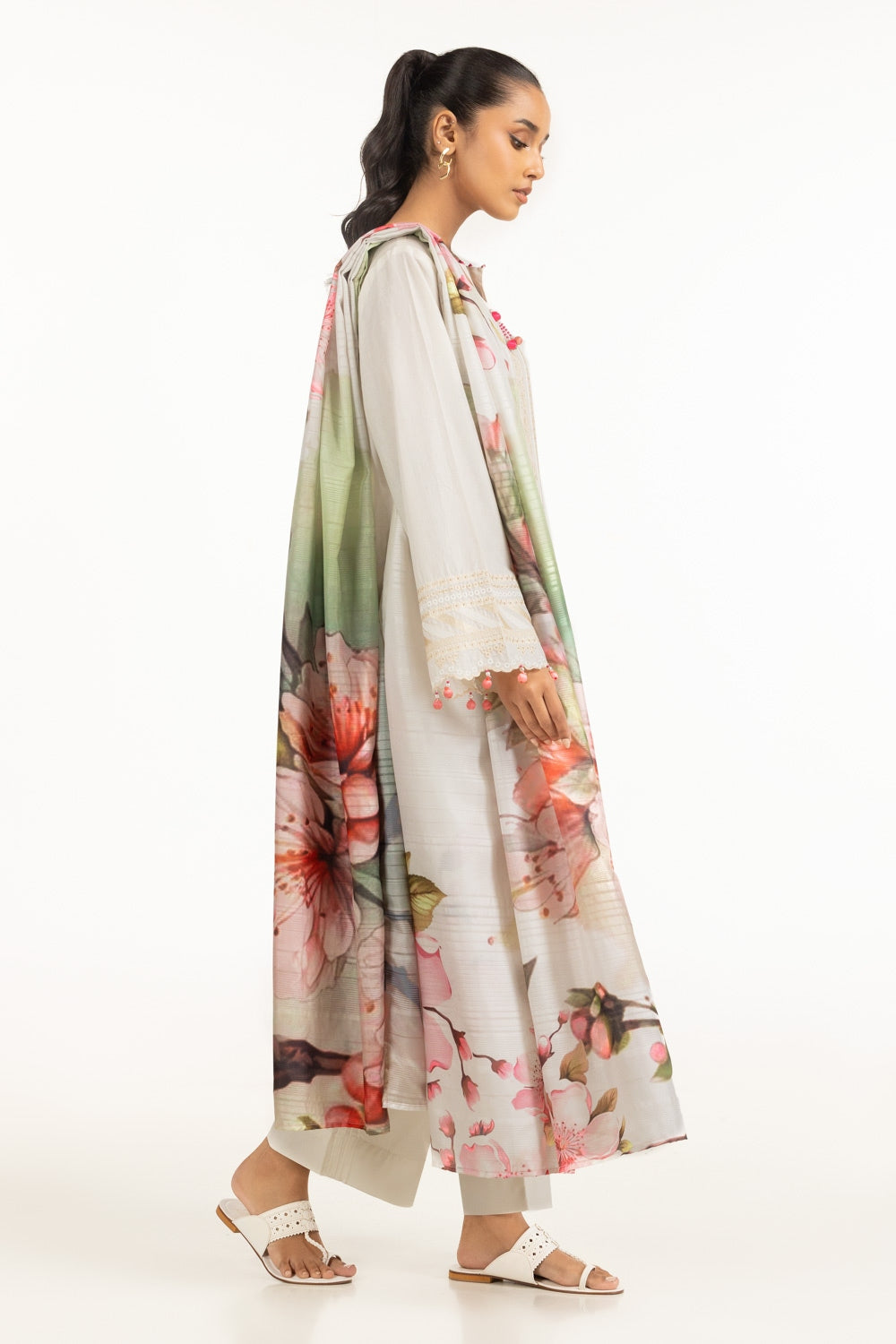 Detailed embroidery glides over breathable lawn shirt, tailored for a graceful summer look. Paired with a relaxed fit dyed trouser and a dupatta featuring a vibrant floral print, makes it perfect for timeless ease throughout the season.