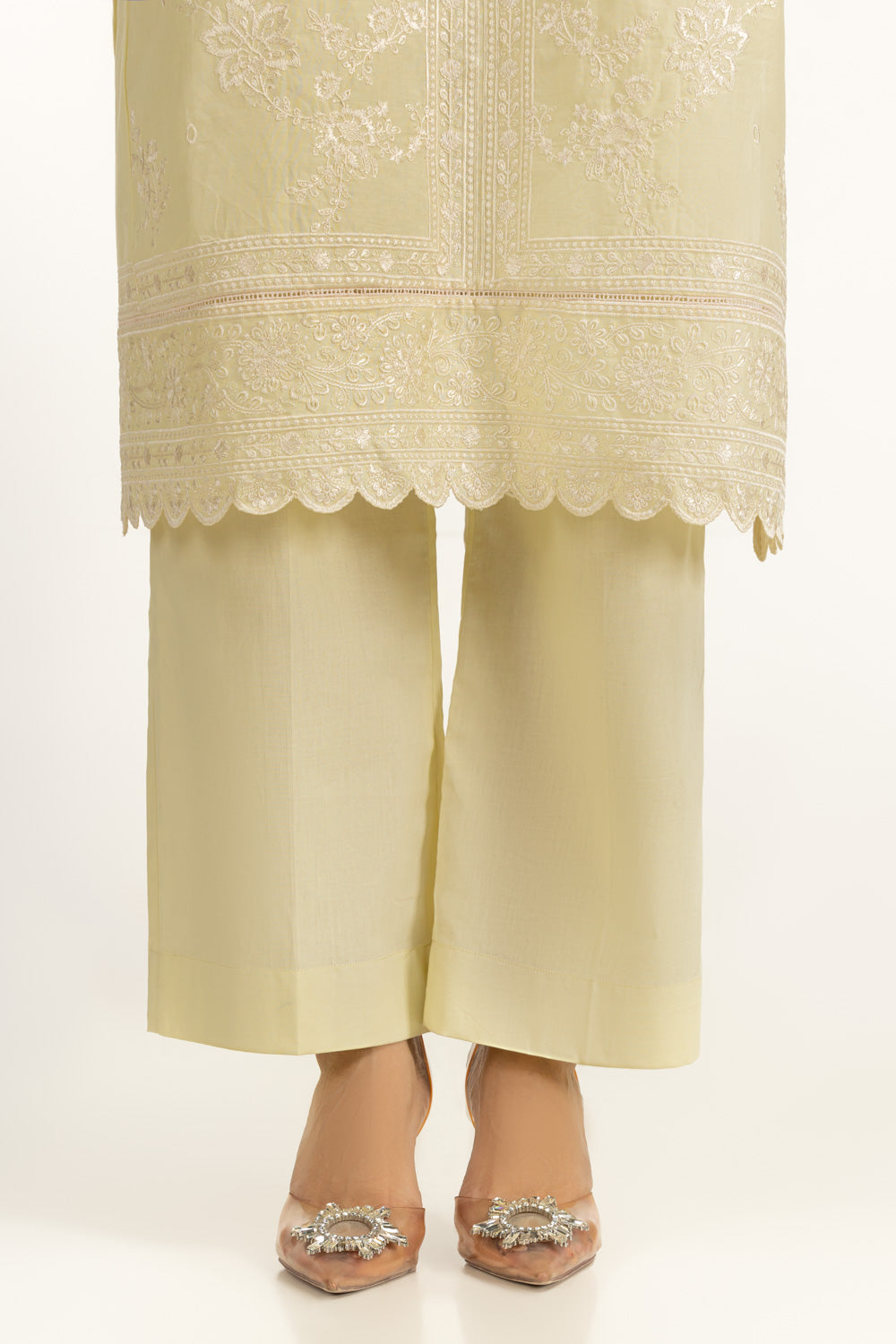 Details: Embroidered suit featuring round-neckline with dori tassels.