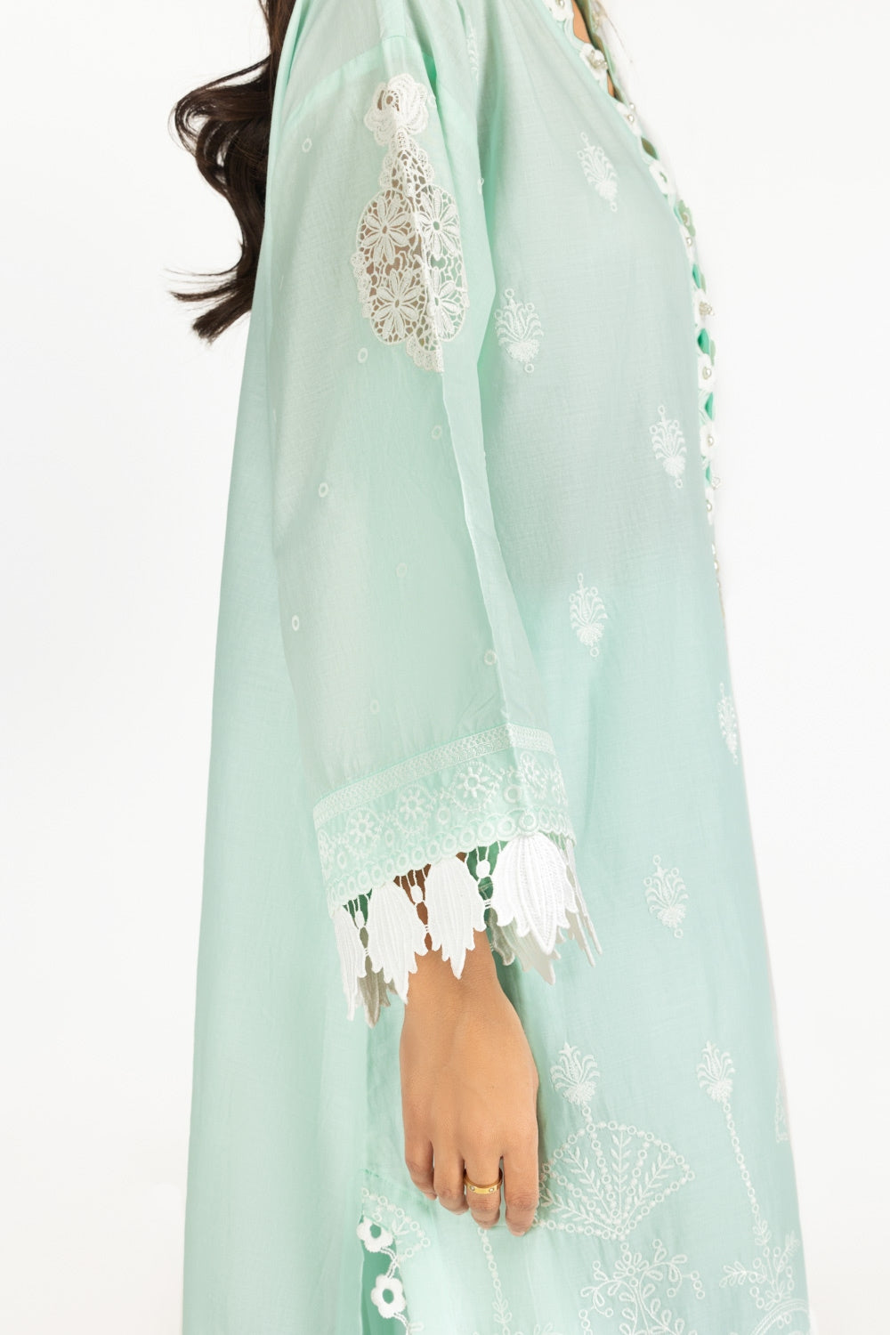 In calm, summer-ready hue, this relaxed-fit ensemble balances traditional vibe with contemporary details. Embroidery highlights the craftmanship, while the subtle embellishment enhances the overall vibe. While the breathable fabric and easy silhouette offer day-long comfort. Perfect for festive celebrations.