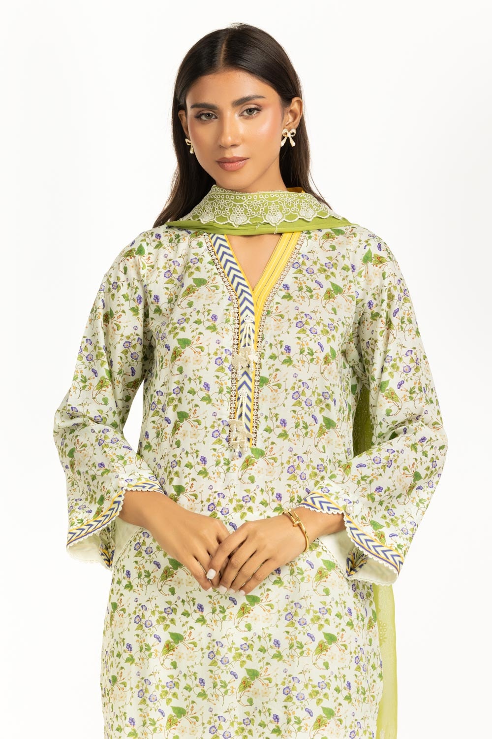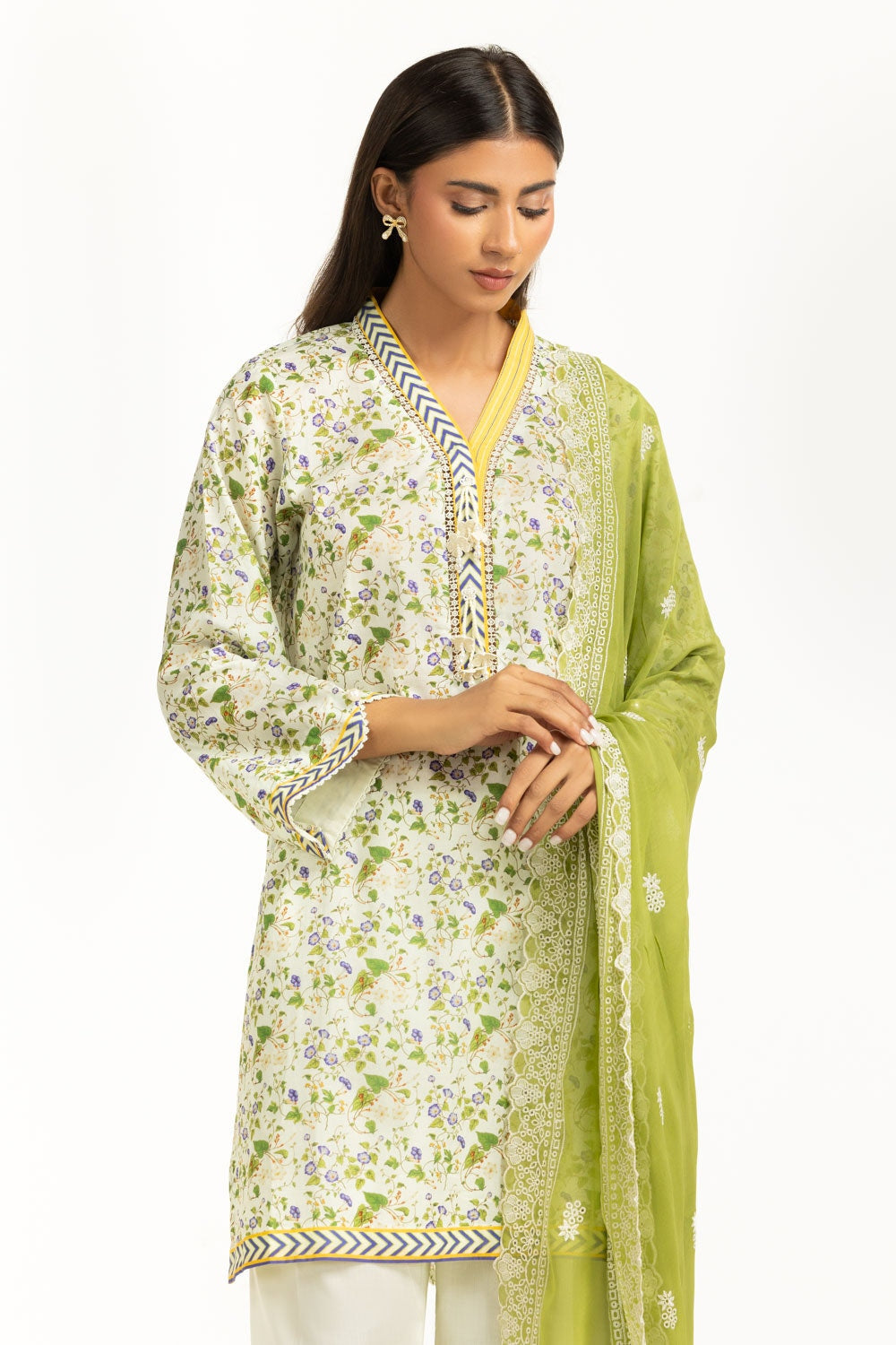 The 3-piece suit features a delicate floral printed shirt and dupatta with plain trousers for effortless everyday wear. The loose-fit silhouette ensures breathability through long, warm hours. Perfect for women who value style with easy wearability.