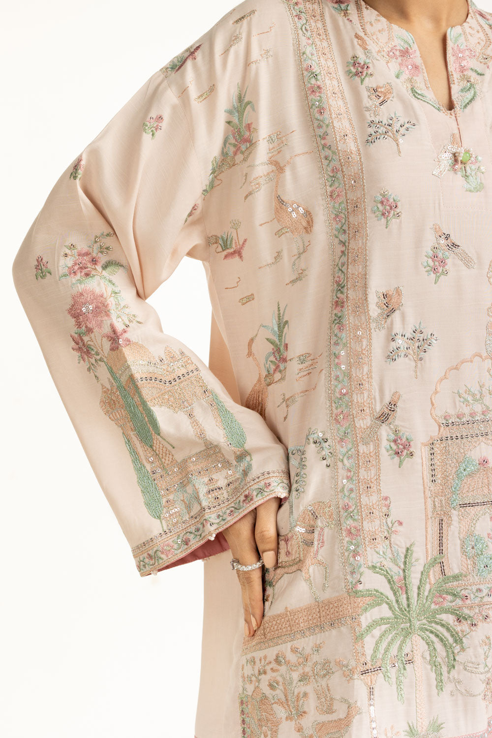 Details: Embroidered suit featuring a Round-Neckline with delicate pearls.