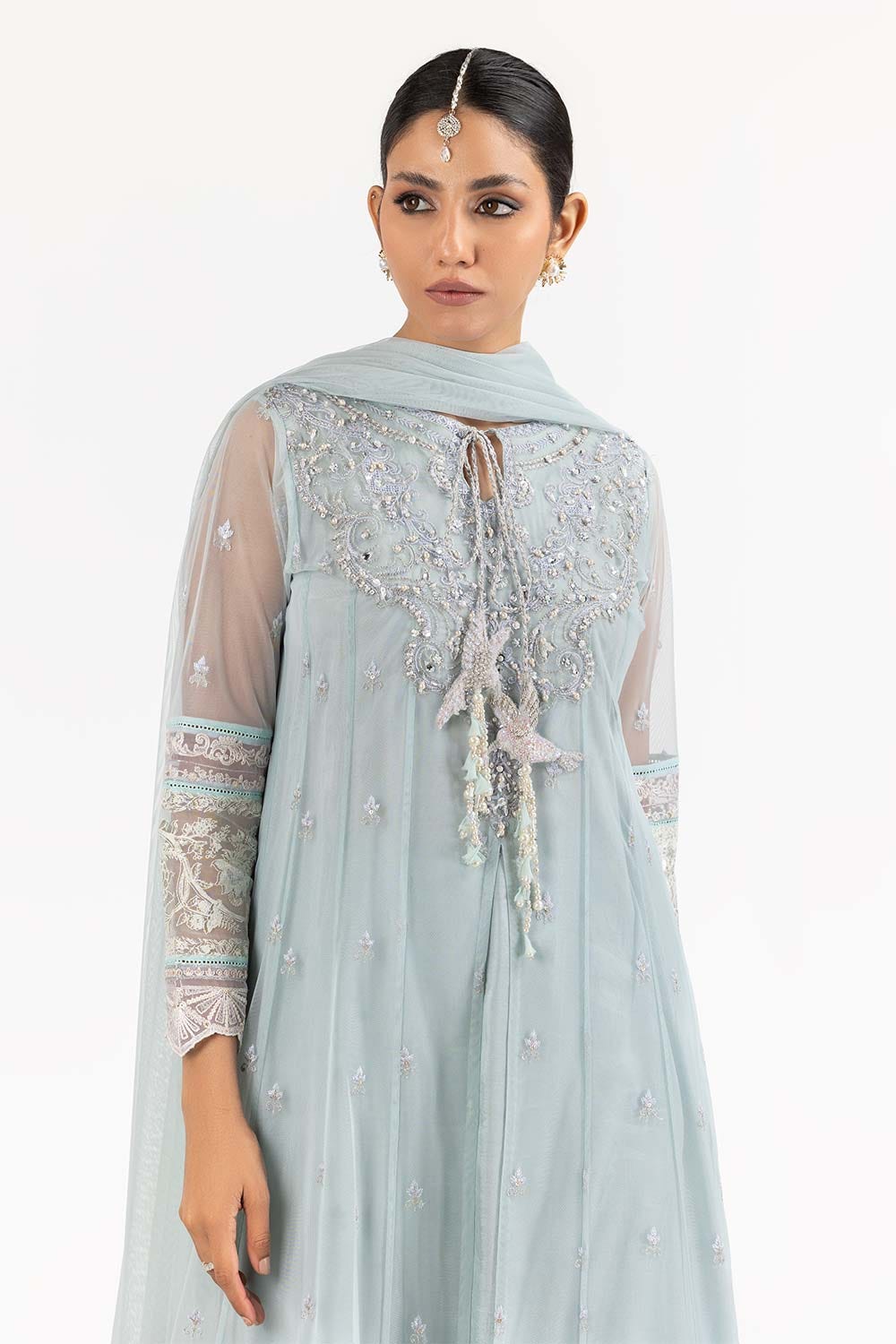 Powder Blue soft net panelled shirt nicely embroidered neckline,sleeves and daman border with pearl embeliishments�� on neckilne and beuatiful tassles on front neck. Paired with printed rawsilk cullottes�� and soft net dopatta.