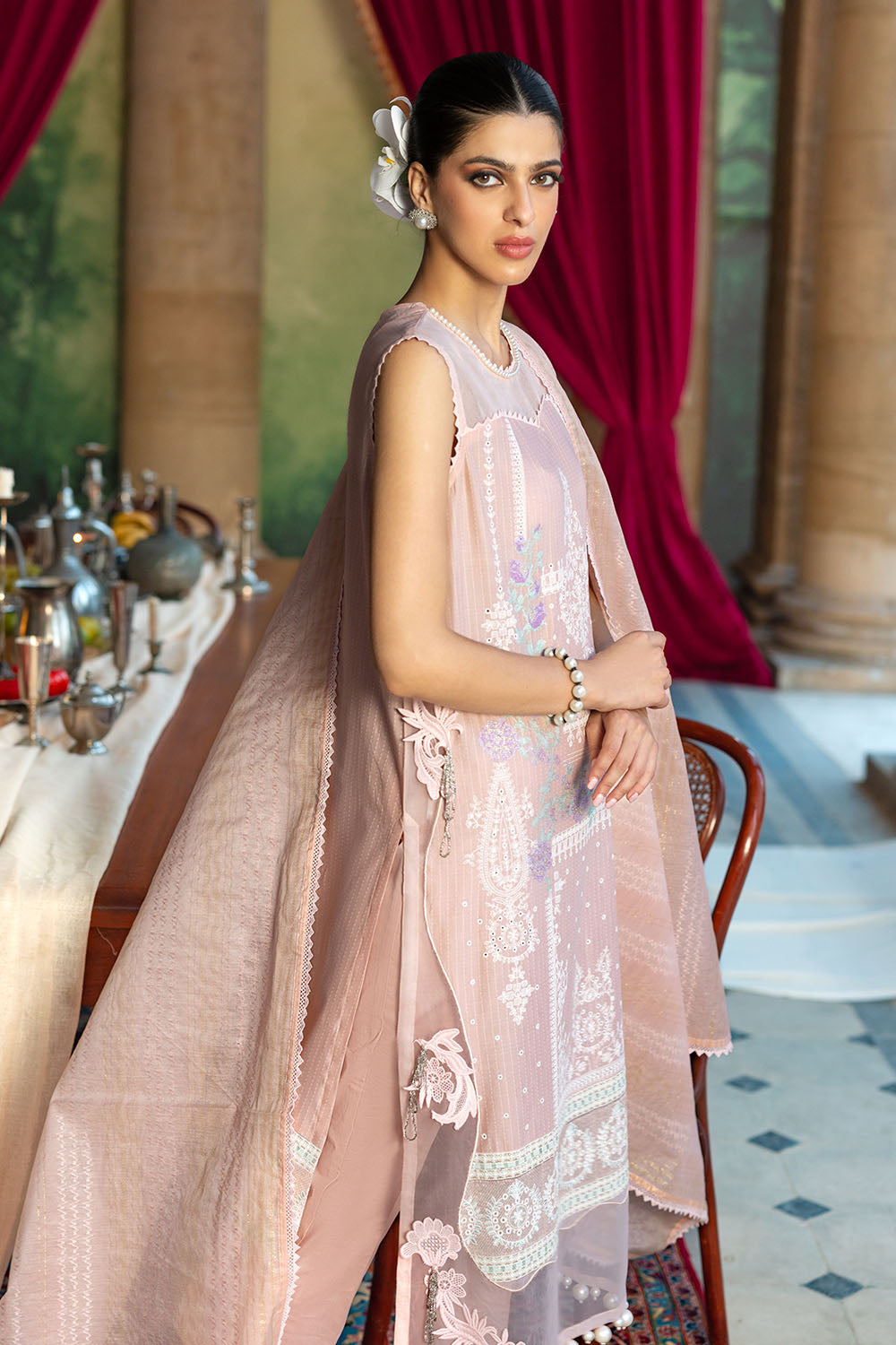 • Embroidered Dobby Shirt Front with Embroidered Borders for Front, Back & Sleeves on Organza. Dyed Dobby Back & Sleeves - 2.78 Meters