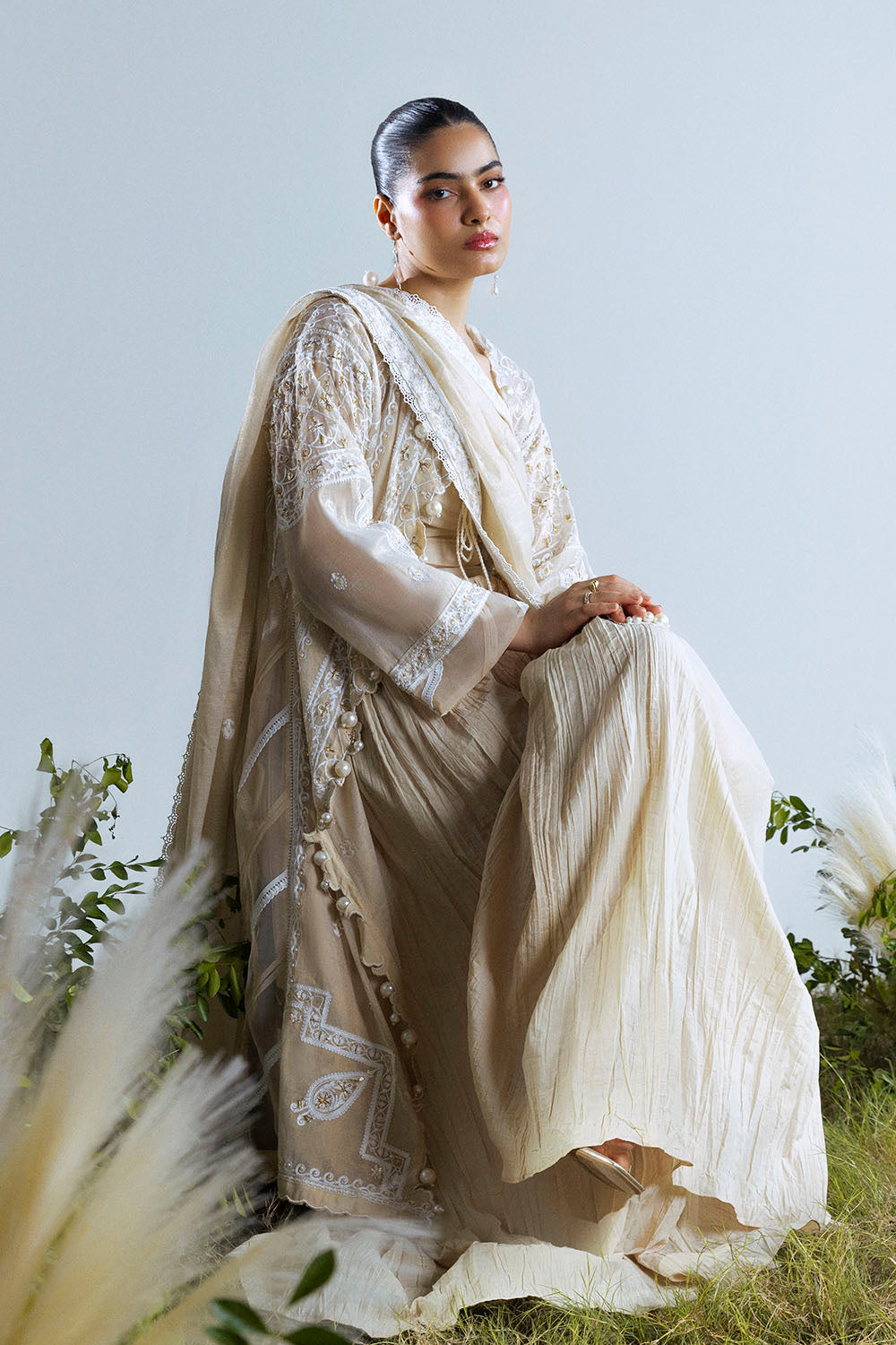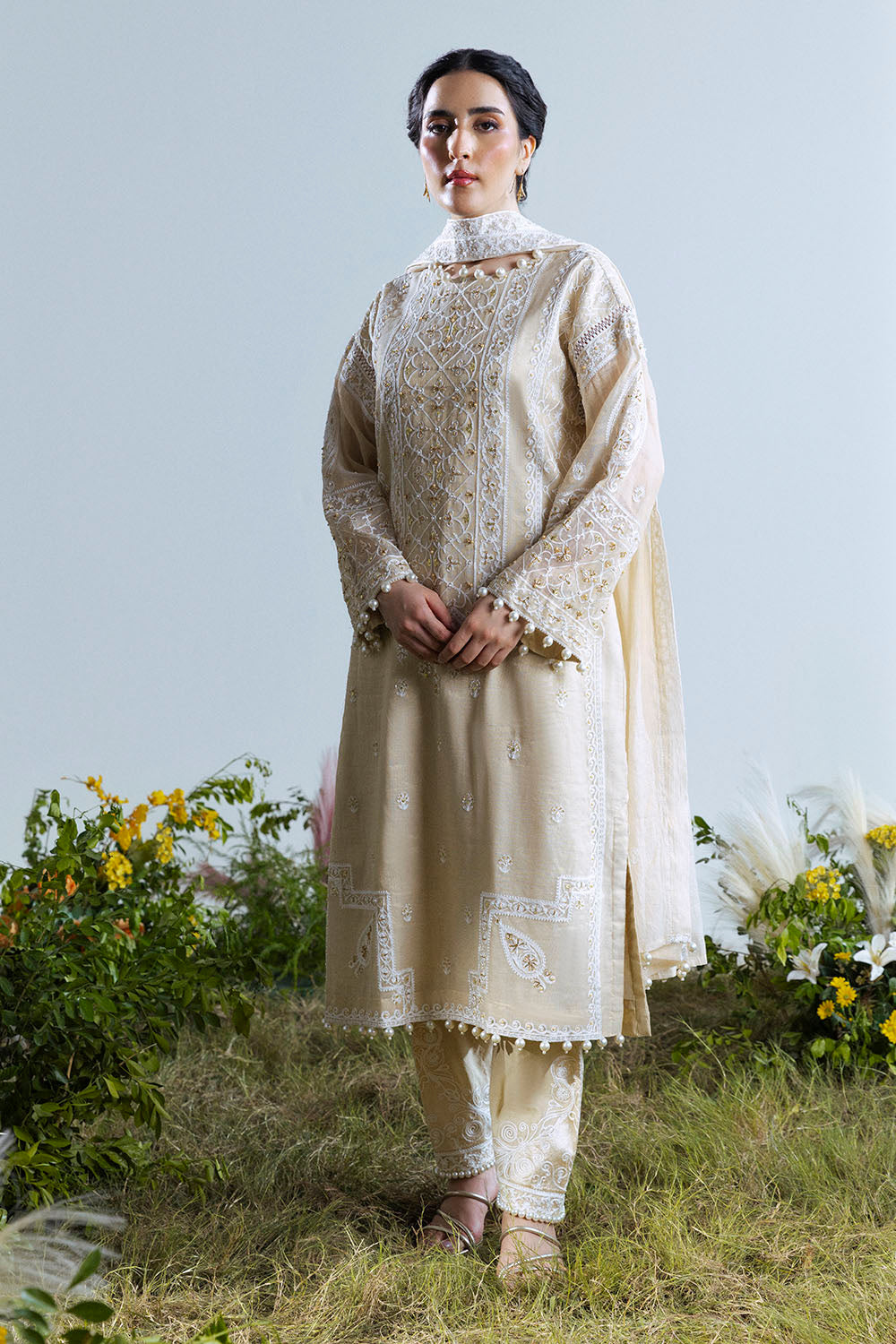 UAE-3 Piece Embroidered Mehsuri Suit with Handwork and Raw Silk Trouser FE-52161