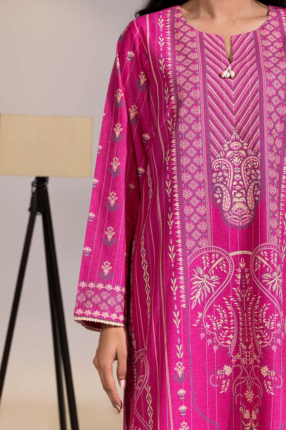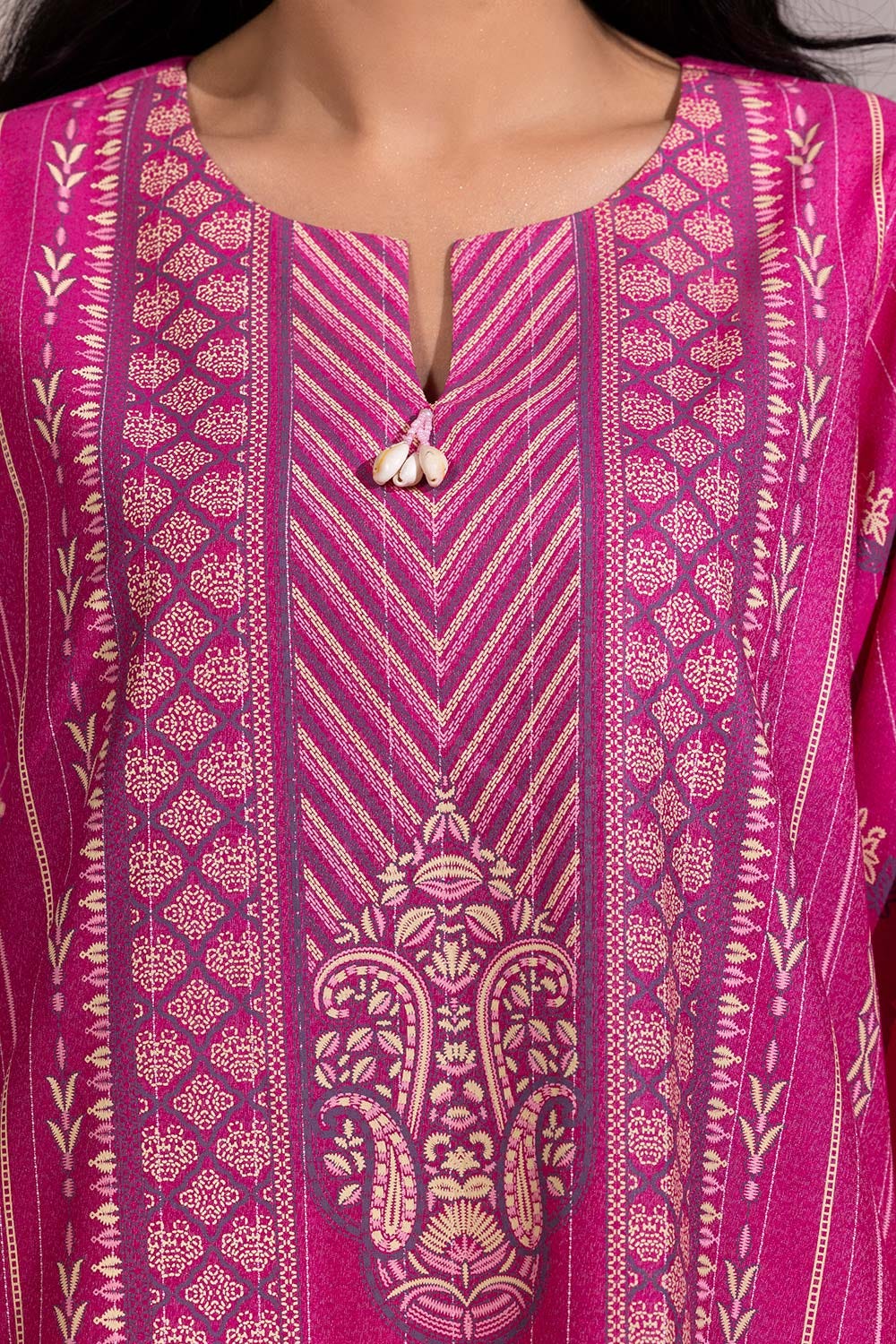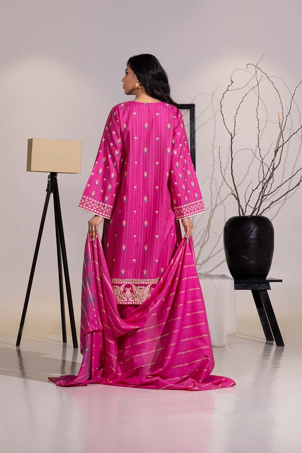 Step into elegance with the 3Pc Karandi Embroidered and Lacquer Printed Suit in a soft pink hue. Featuring a beautifully embroidered Karandi fabric shirt, tailored straight pants, and a classic solid yarn-dyed dupatta, this ensemble is the perfect blend of sophistication and style. Ideal for adding a refined touch to any occasion.