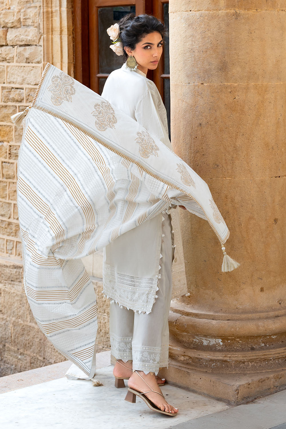 • Gold, Silver & Lacquer Printed Denting Lawn Dupatta - 2.5 Meters