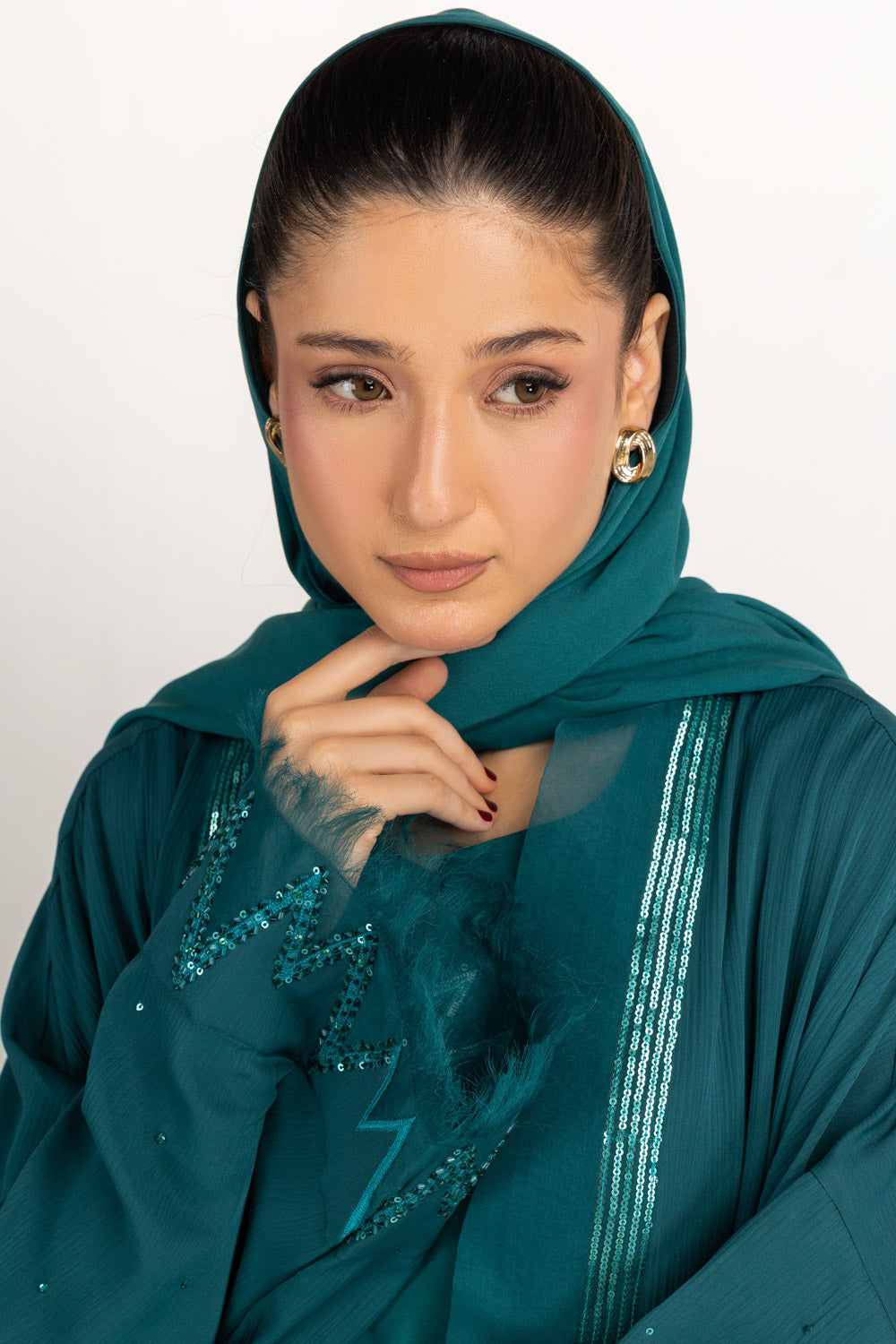A refreshing take on modest summer fashion, this front-open Abaya blends elegance with effortless comfort. Made from breathable crush georgette, it drapes beautifully over a crepe georgette inner, creating a sleek layered look. It’s beautiful embroidered detail enhances the overall look, finished with a matching crepe georgette scarf, this lightweight ensemble is perfect for small gatherings.