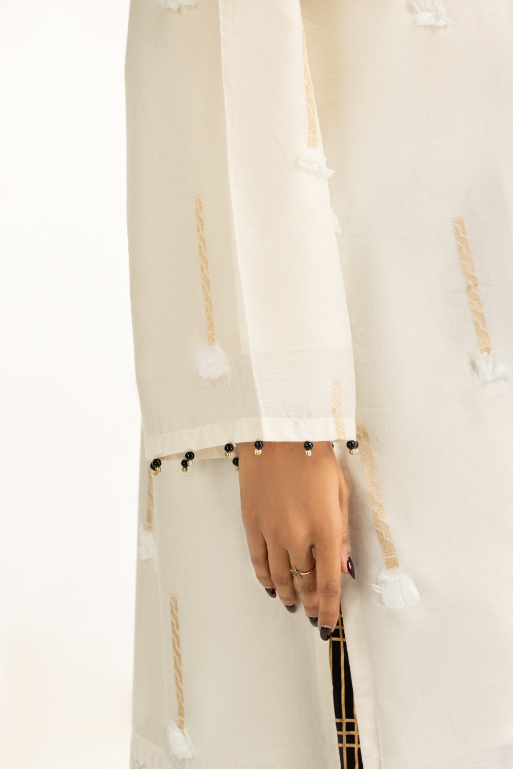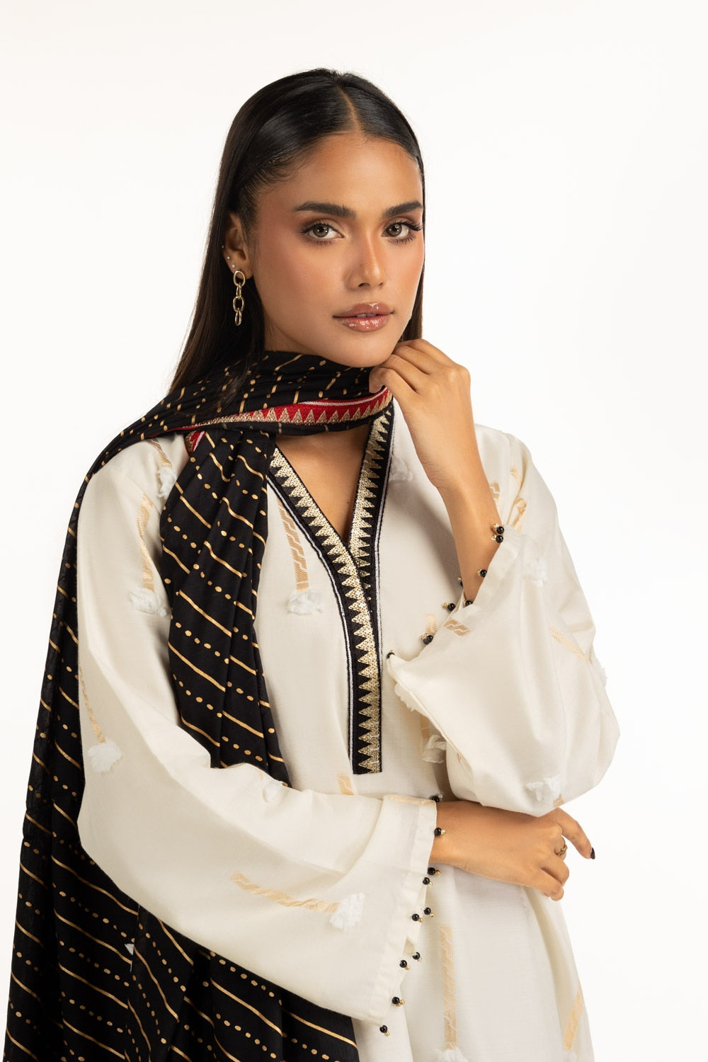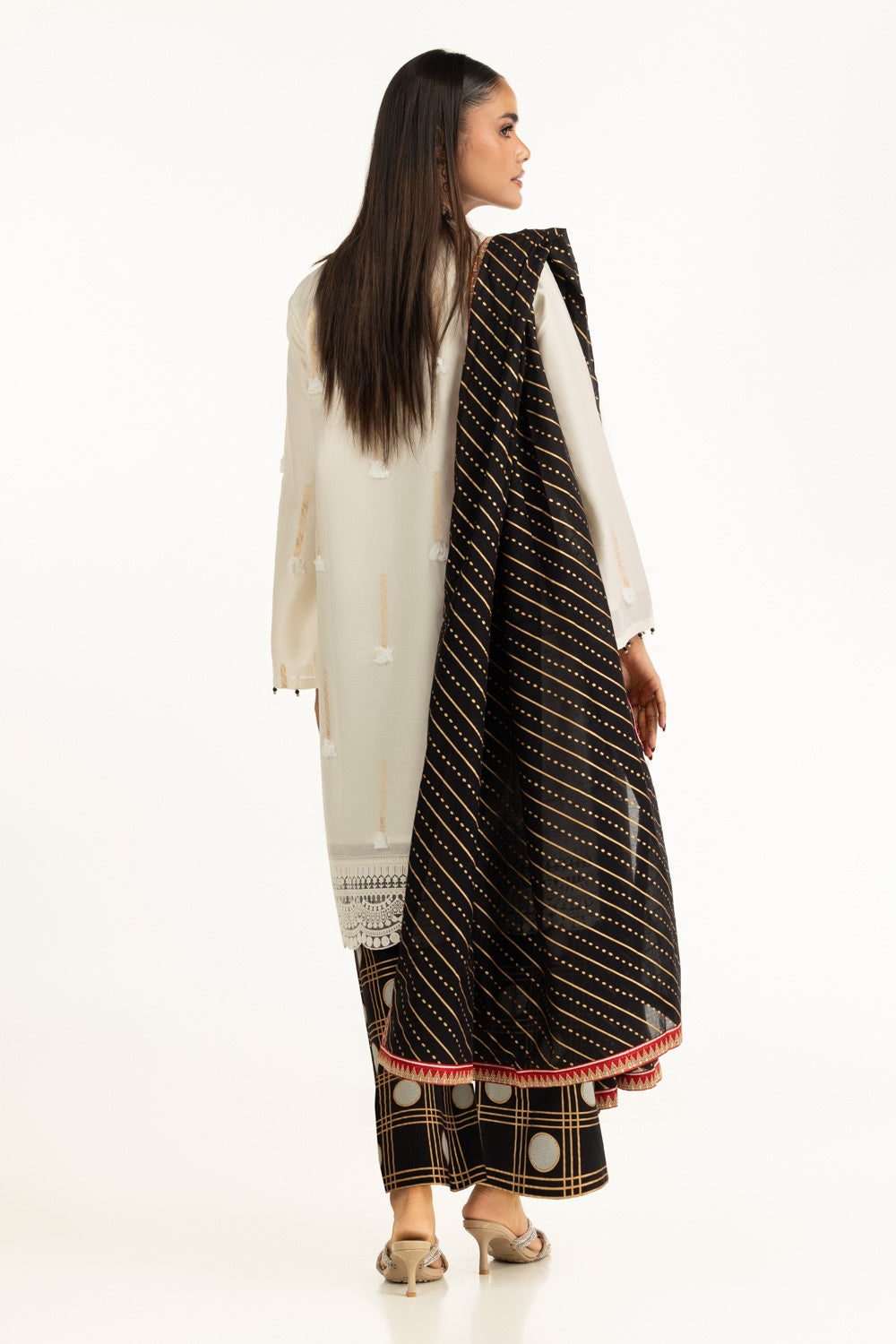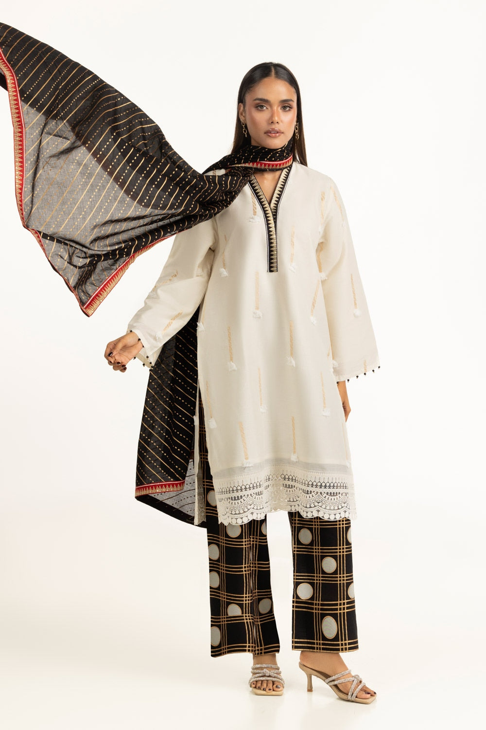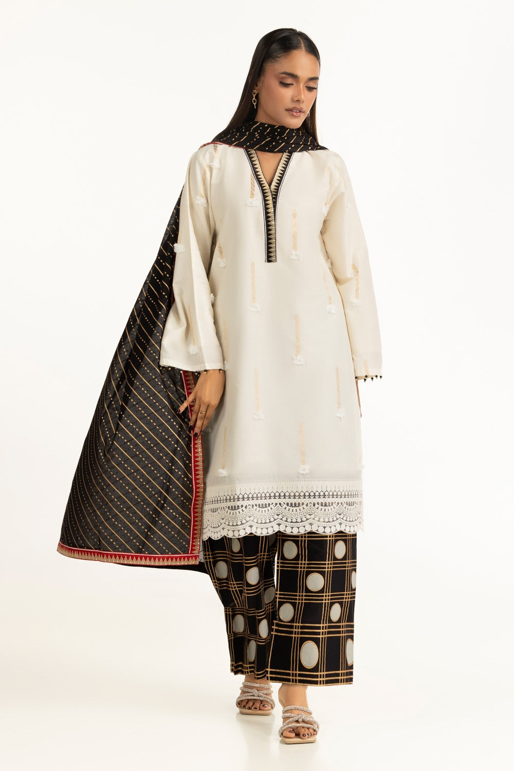Textured to perfection, this suit features minimal embroidery that rests gently across a Jacquard weave, catching light in the subtlest way. Its loose-fit silhouette is designed to flatter while keeping things cool and unconfined. A refined and contemporary pick for today���������������������������s woman with fashion-forward choices.