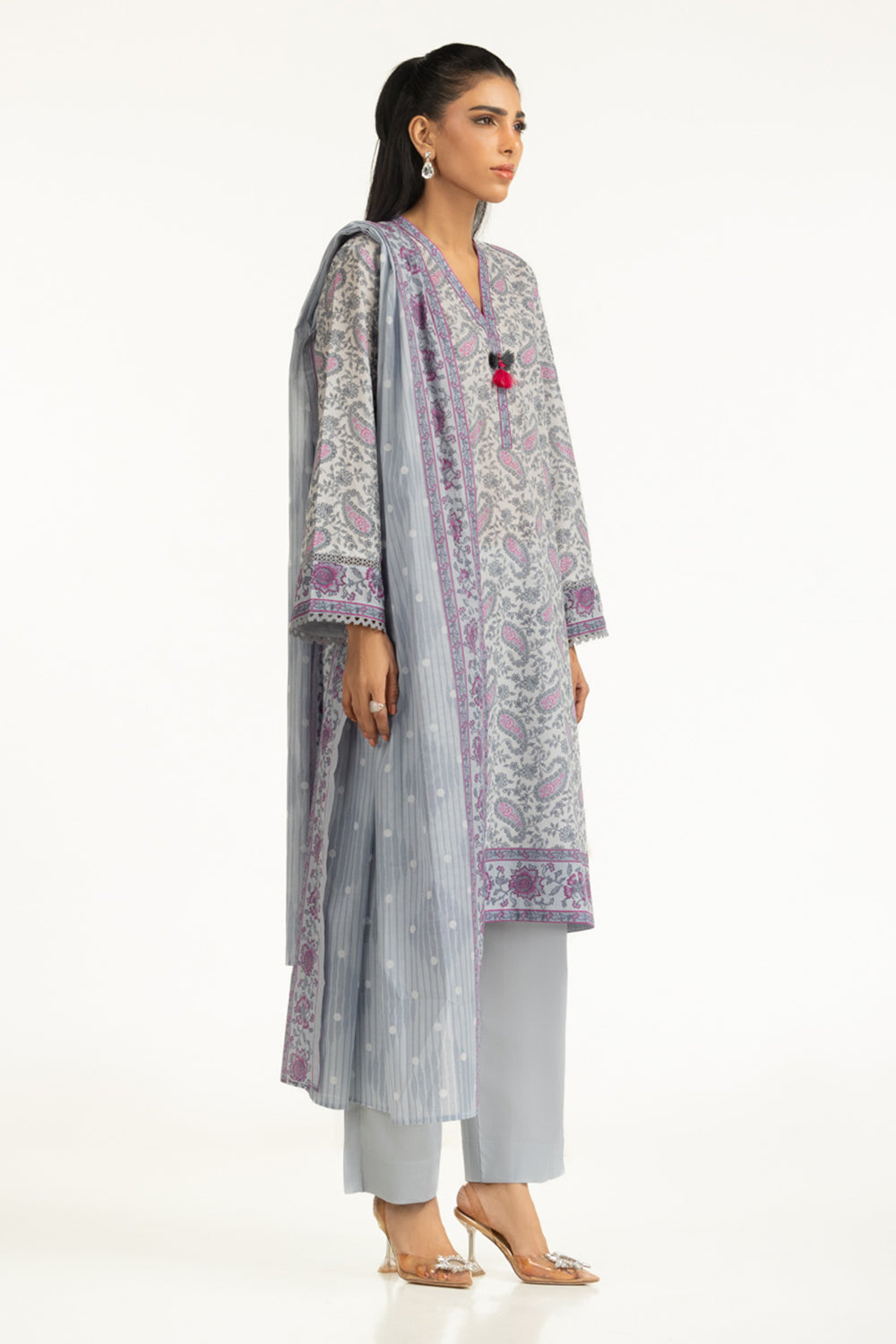Designed with a soft grey palette, this lawn suit feels light and breathable throughout the day. While its relaxed structure makes it suitable for long hours. Paired with a solid trouser, it remains understated and functional.