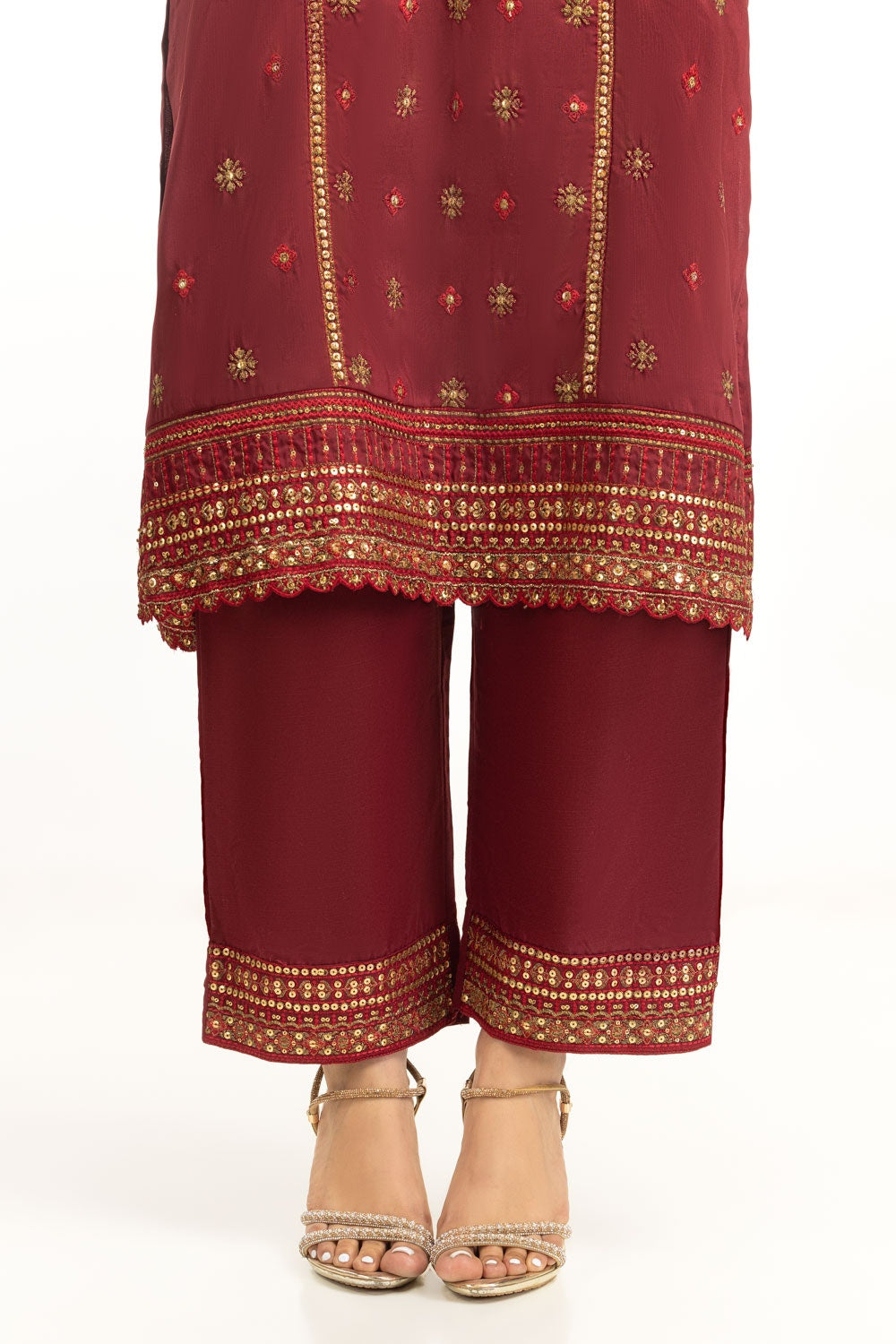 This rich maroon color pairs summer comfort with traditional detailing. The relaxed fit silhouette keeps it breathable, while the detailed sequin work highlights the craft. With the matching trousers and a stunning Banarsi dupatta, curate a festive look which is modern and comfortable.