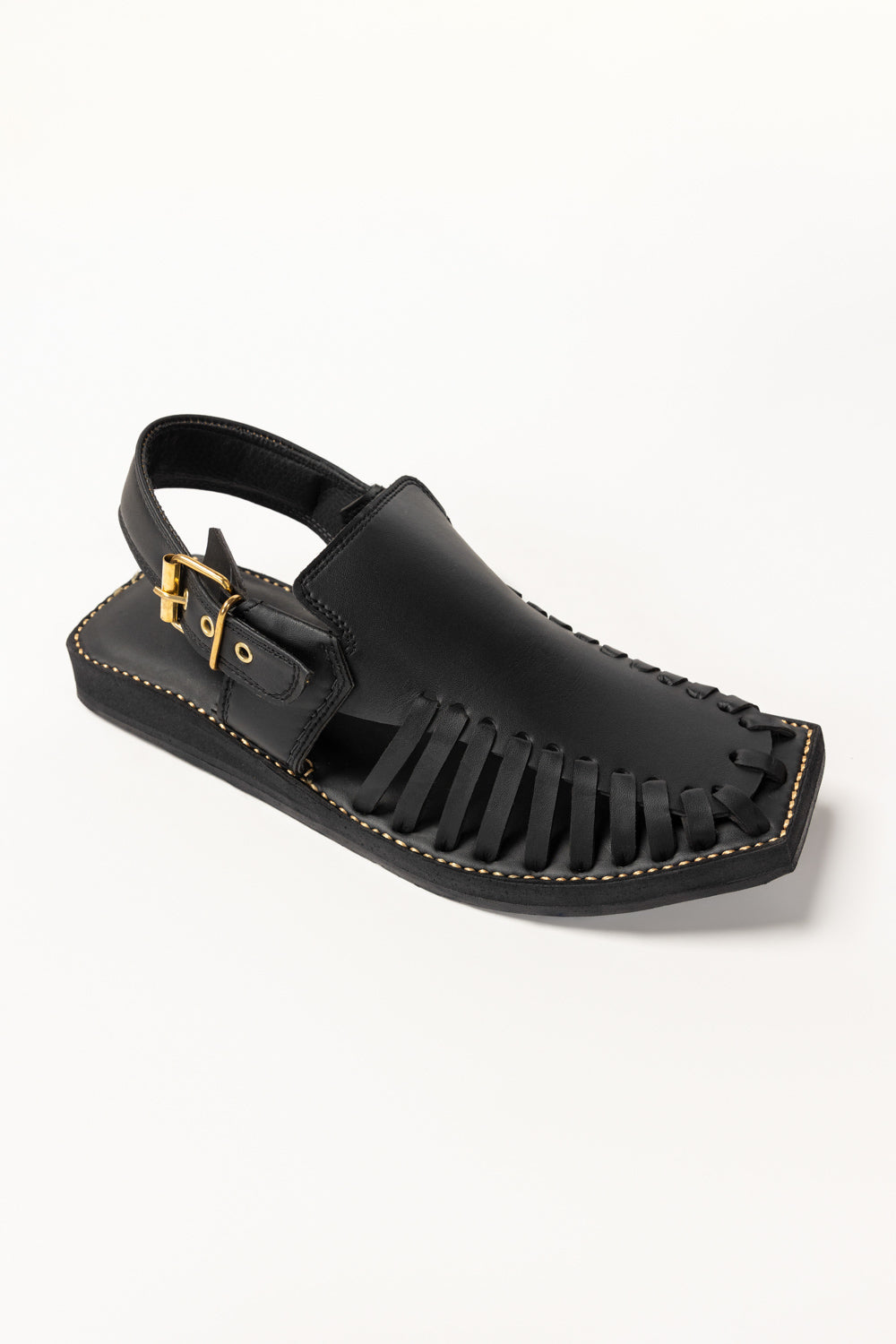 These black leather Peshawari sandals blend traditional craftsmanship with modern durability. Designed with handwoven detailing and a square toe, they exude elegance and comfort. Finished with an adjustable buckle, perfect for formal and semi-formal wear.