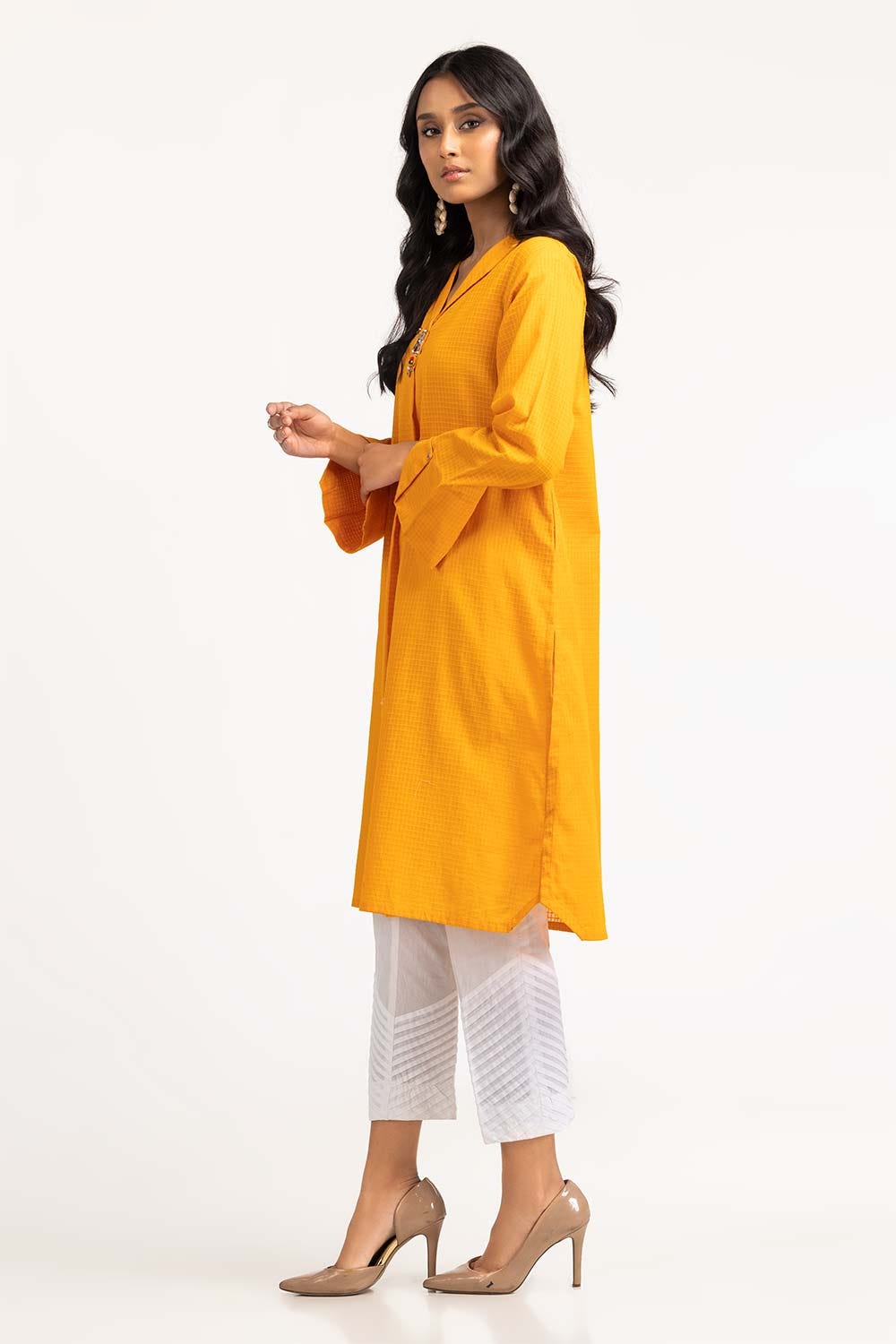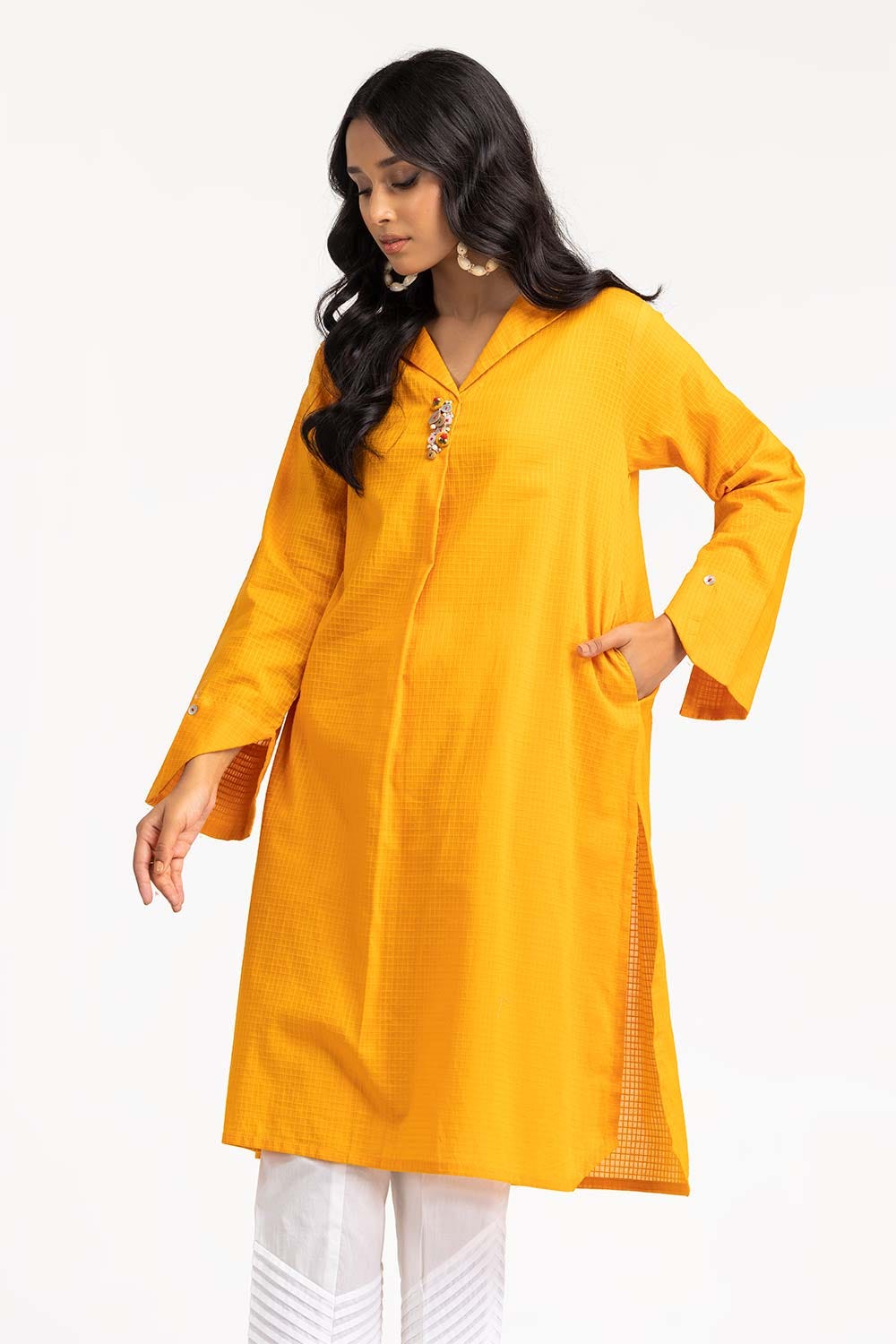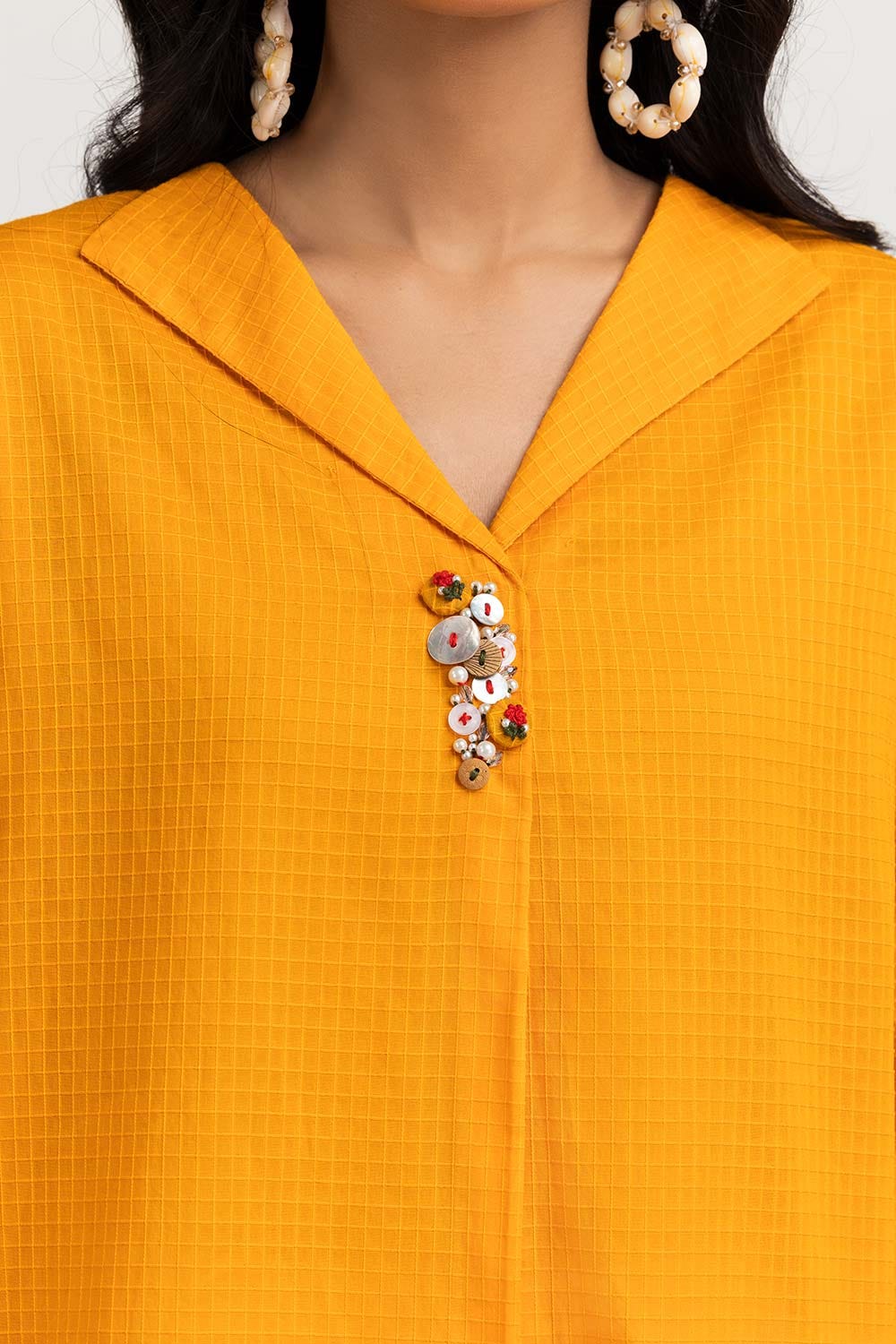 Yellow dobby embellished shirt featuring a V neckline with details, straight sleeves with folded details and a geometric hem.������������������������������������"
