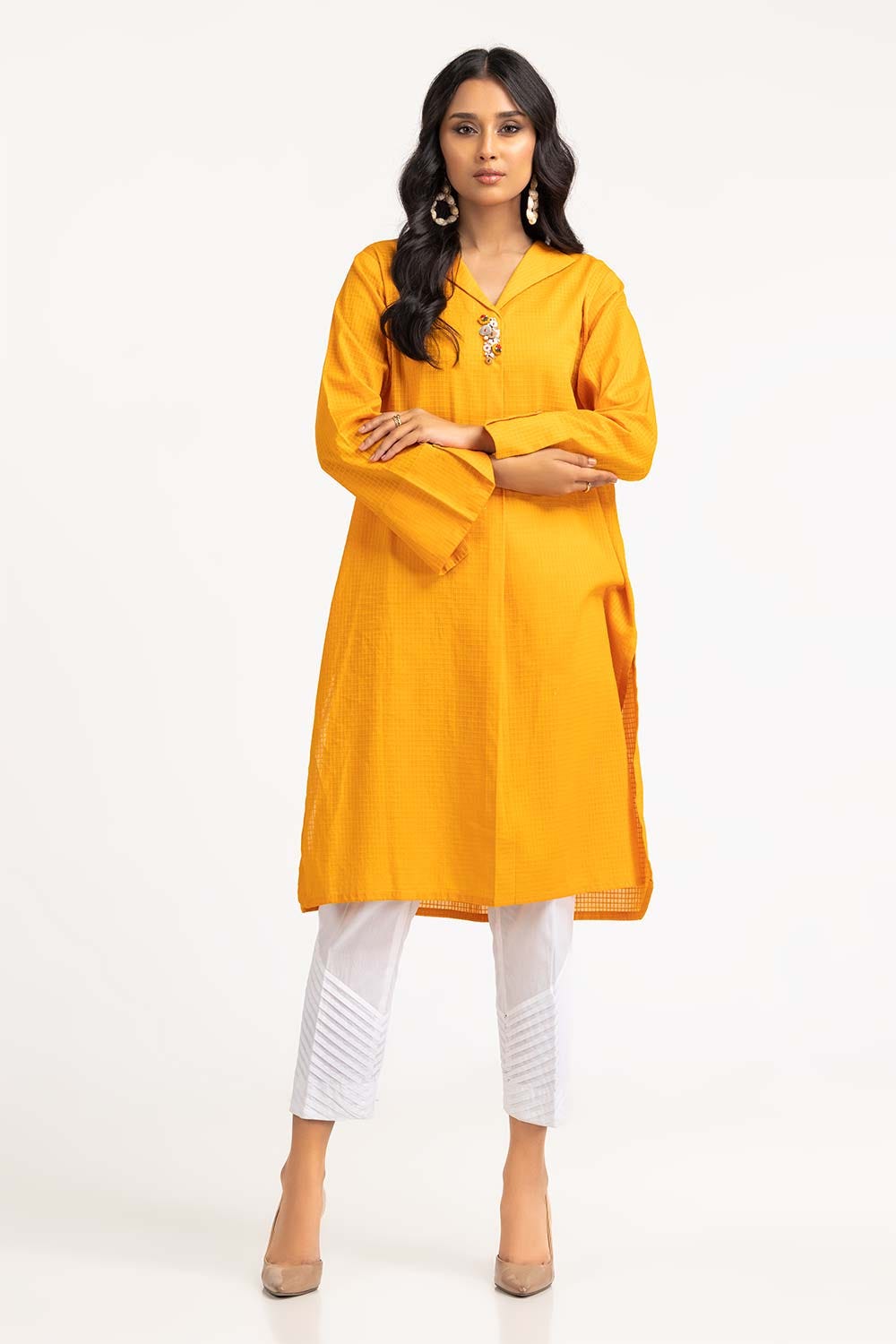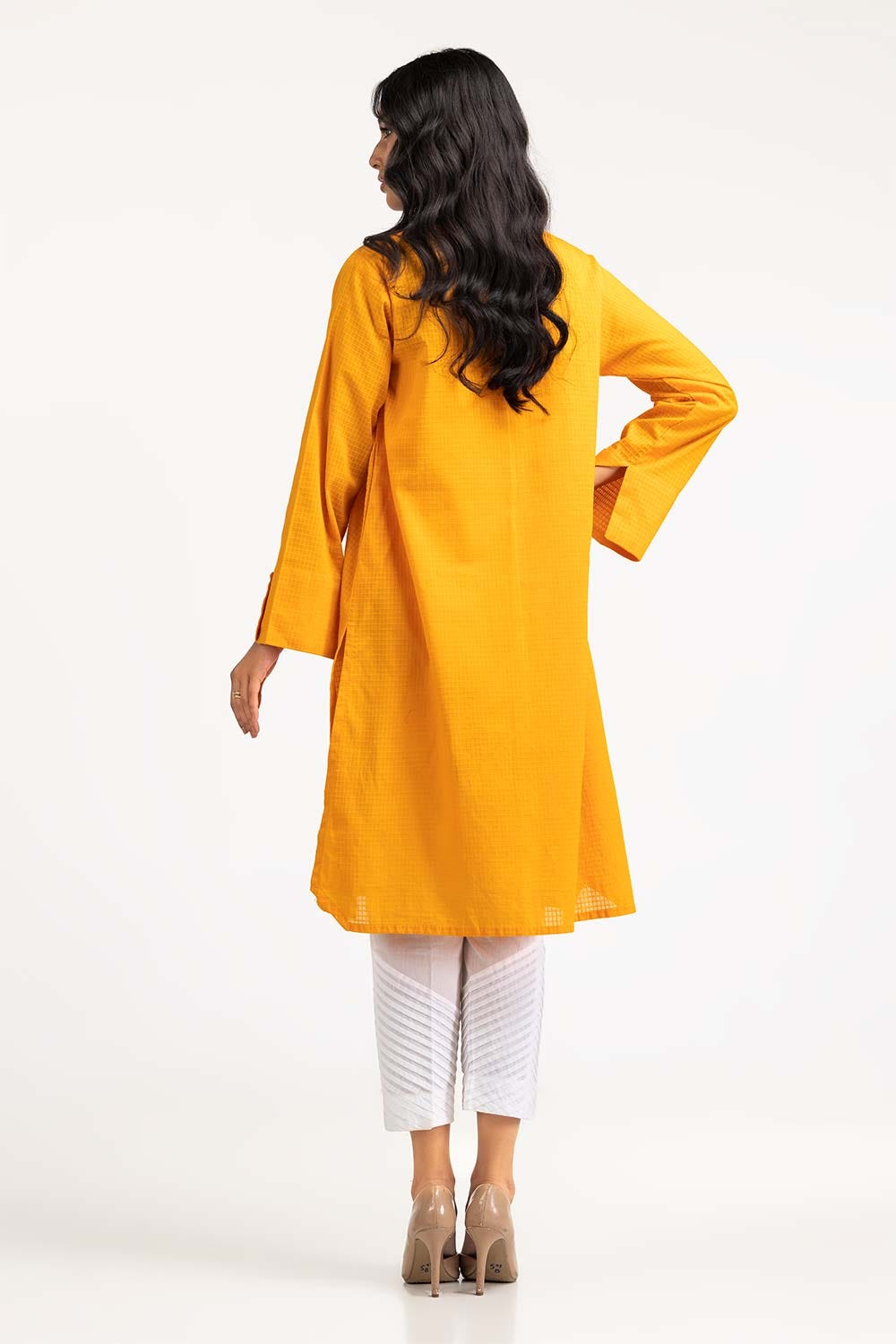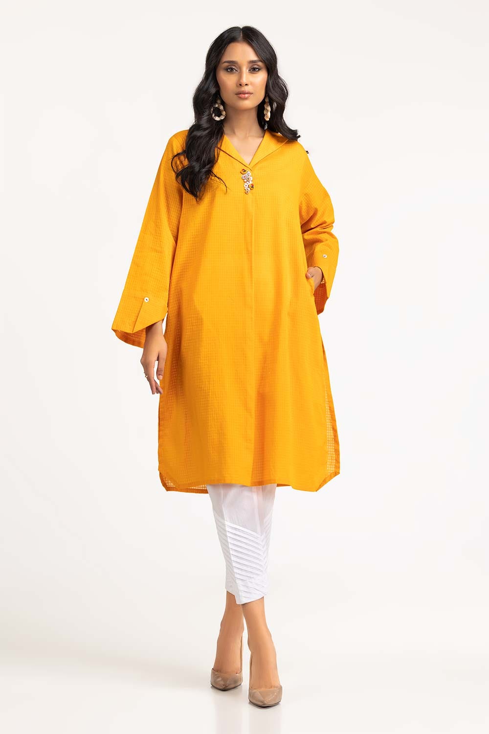 Yellow dobby embellished shirt featuring a V neckline with details, straight sleeves with folded details and a geometric hem.������������������������������������"