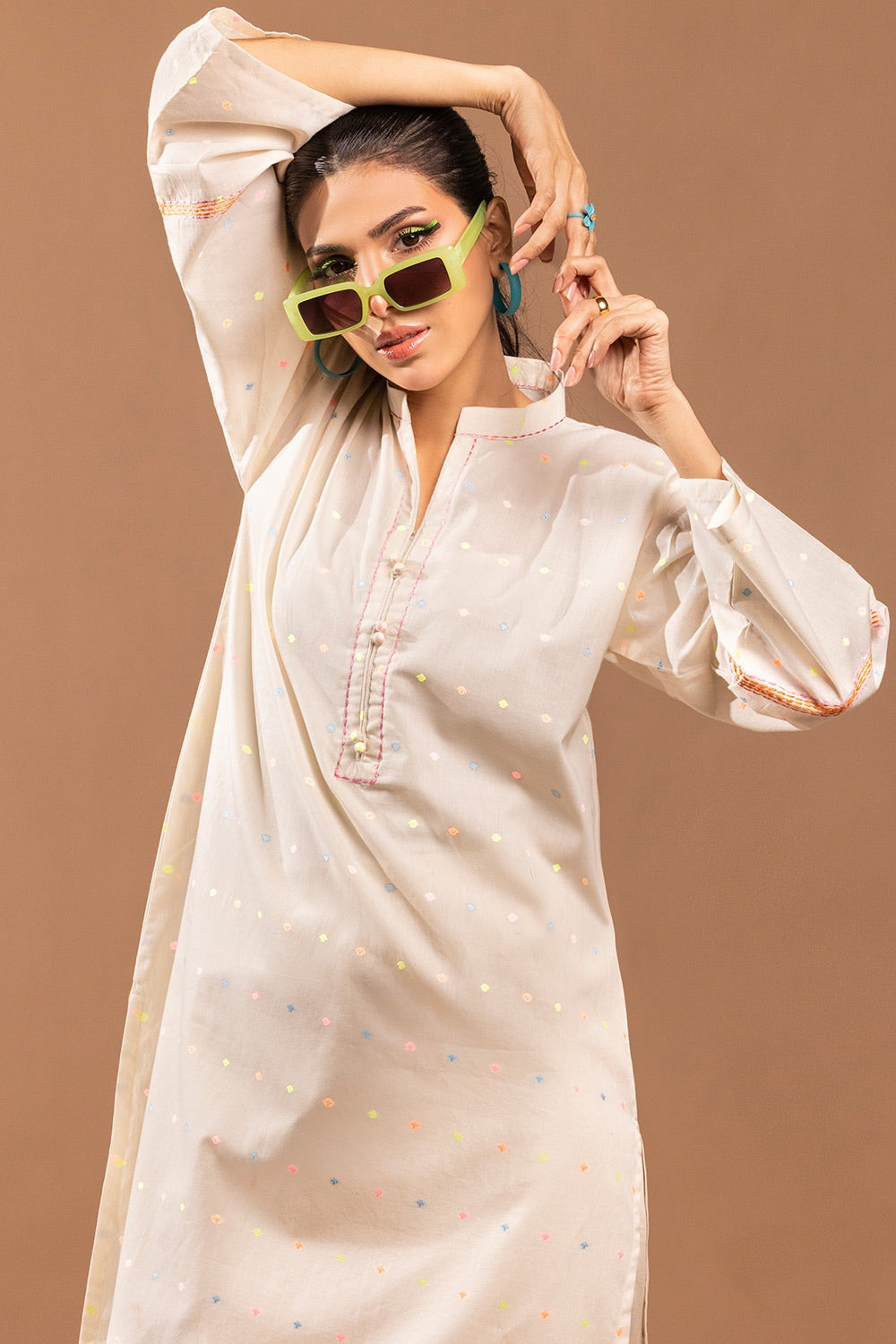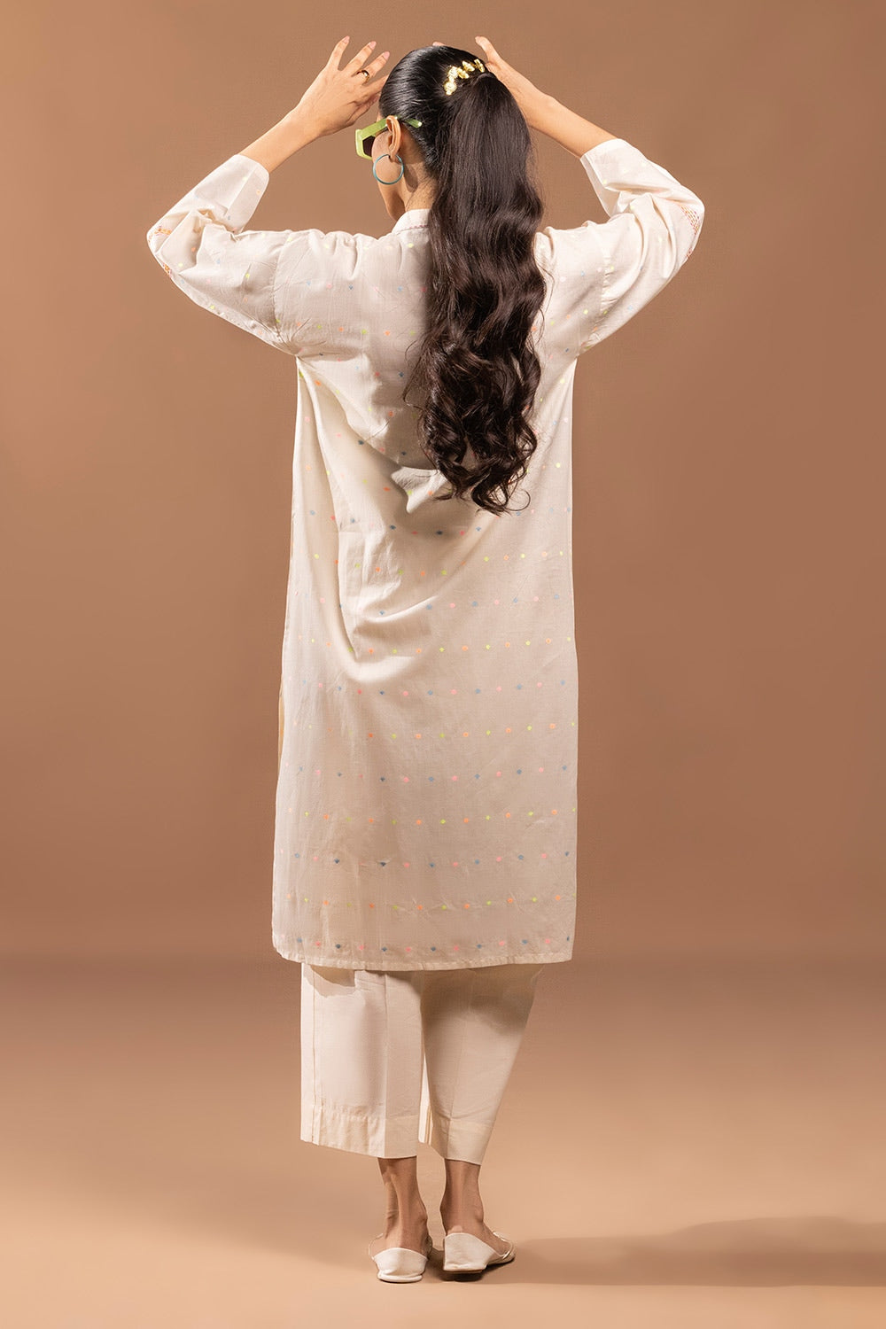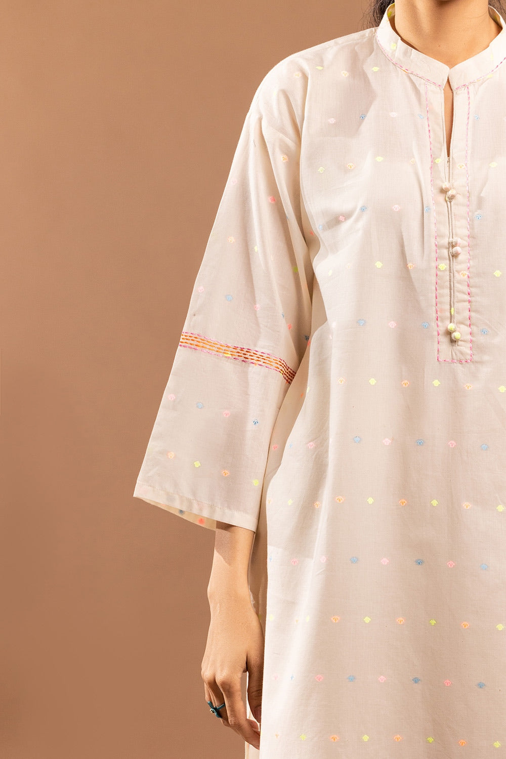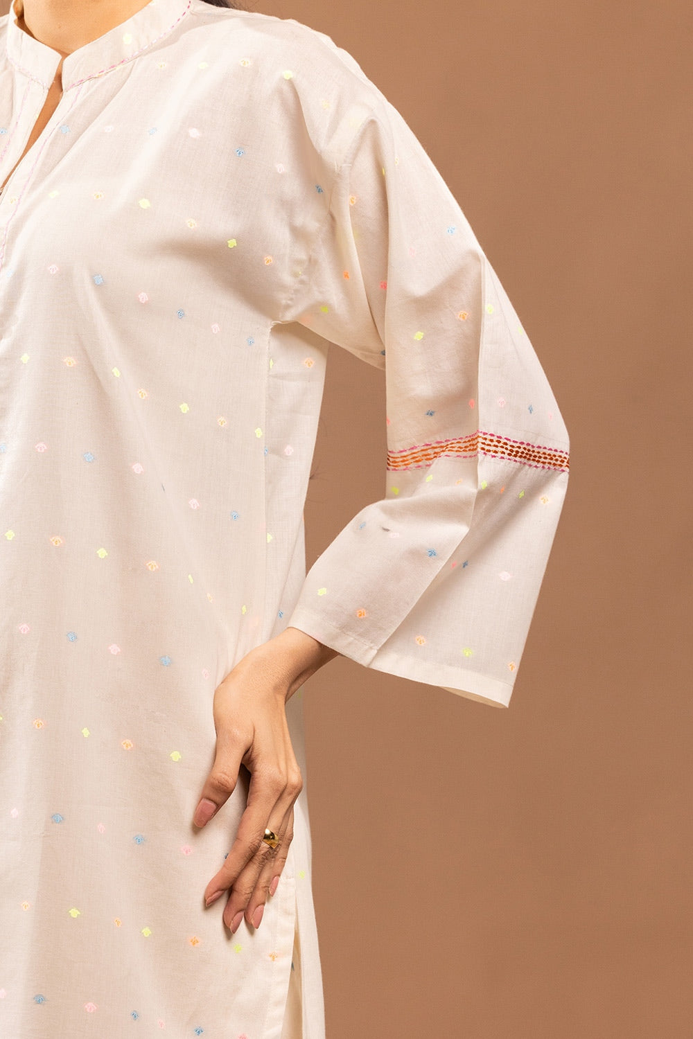 Ready to wear Elevate your style with this sophisticated beige kurta. Featuring delicate multicolored design, embellished placket and a mandarin collar, this long-sleeve kurta is perfect for any occasion.
