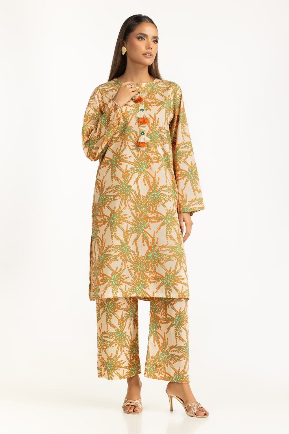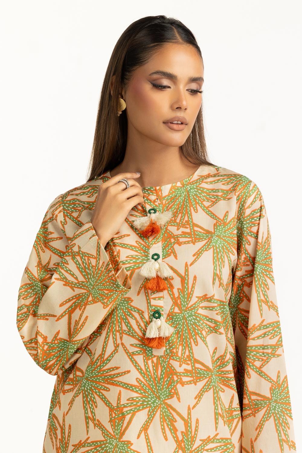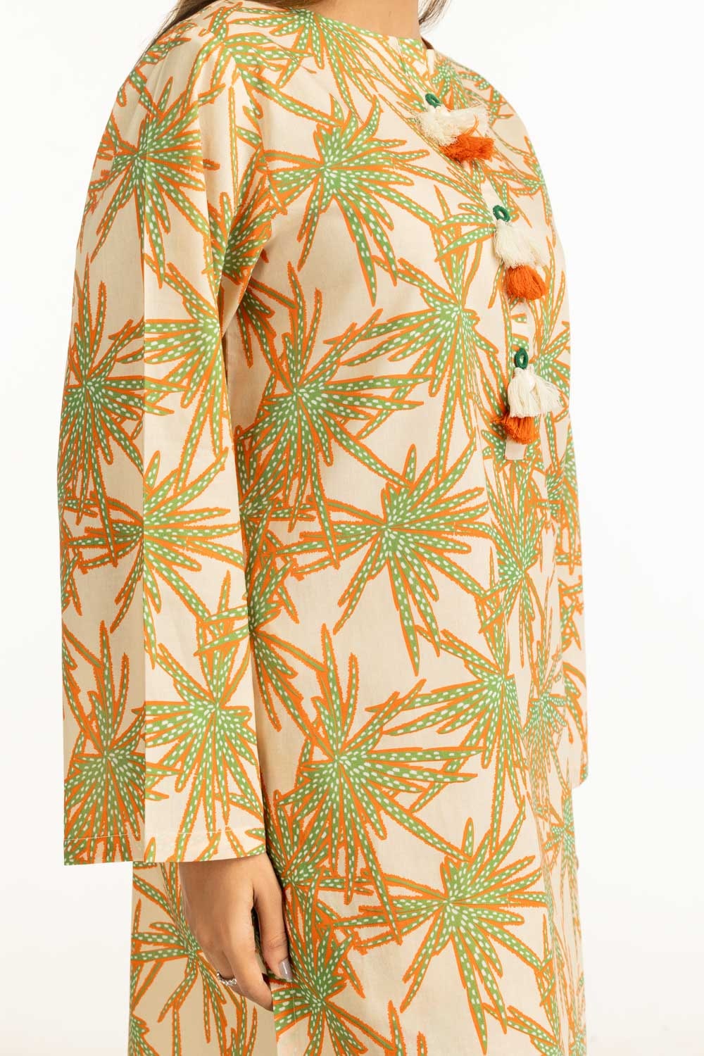 Details: Printed Co-ord set featuring a Round-Neckline with tassels.