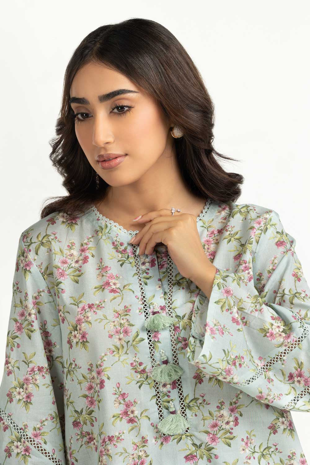 Details: Printed co-ord set featuring round split-neckline with delicate lacework and tassels.