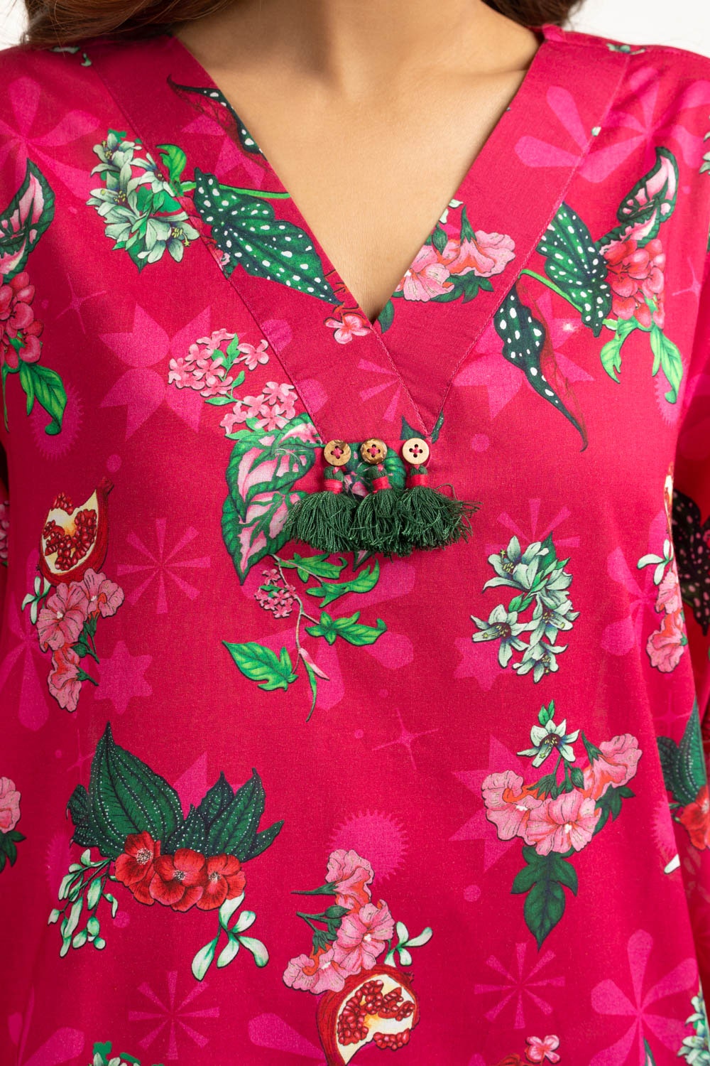 Details: Printed Co-ord set featuring Cuff Sleeves with a V-Neckline and Tassels