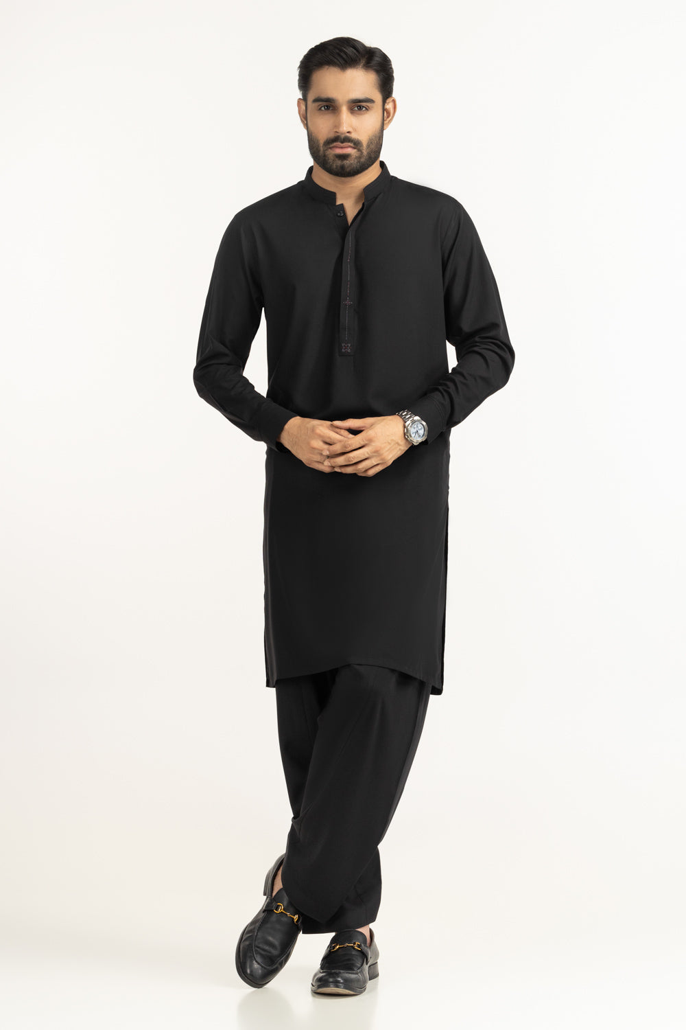 This Kameez and trouser set is offering unmatched comfort and a crisp look. Designed in a regular fit, it features a sleek band collar and detailed placket embroidery that enhances its minimalist appeal. Perfect for festive gatherings or smart casual wear, this ensemble blends traditional charm with modern sophistication.
