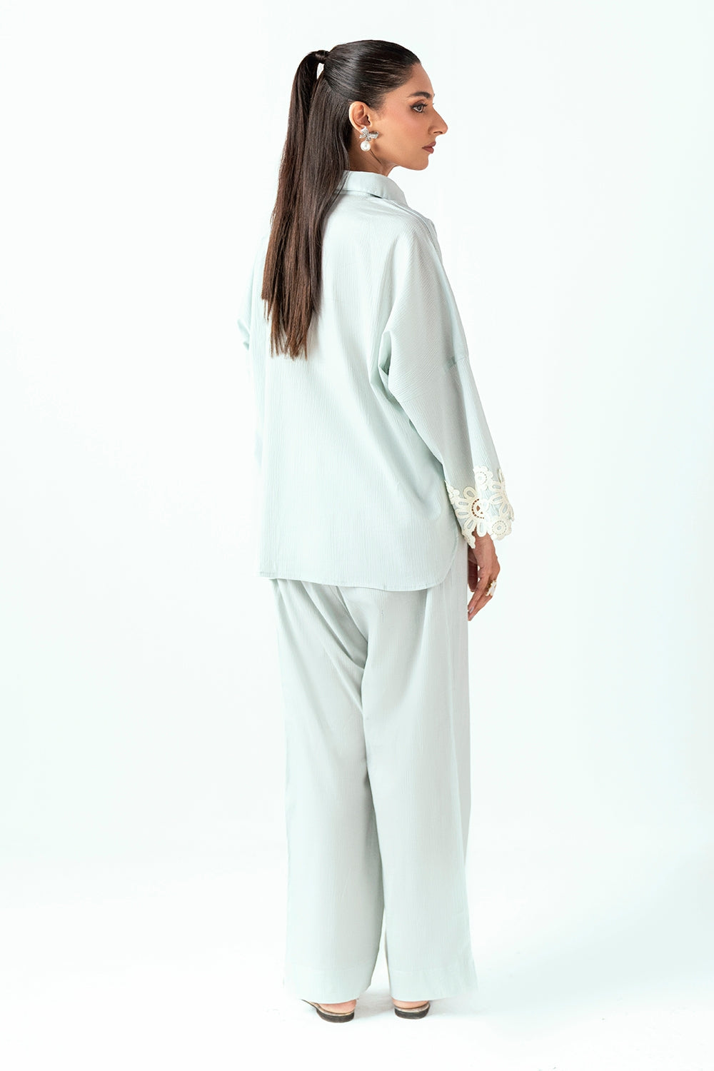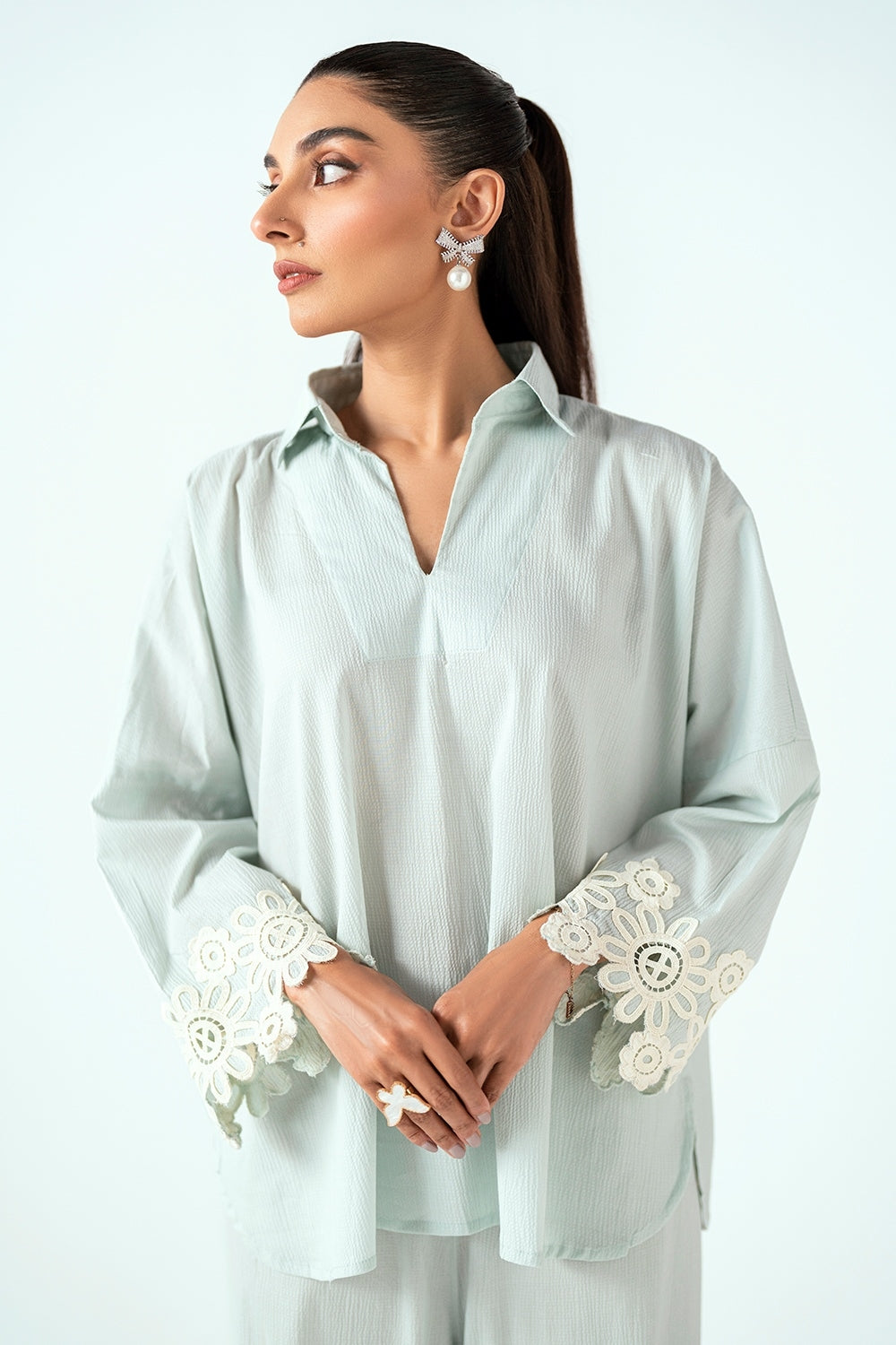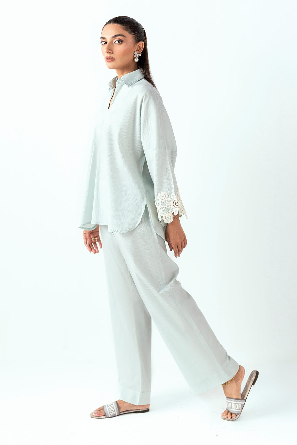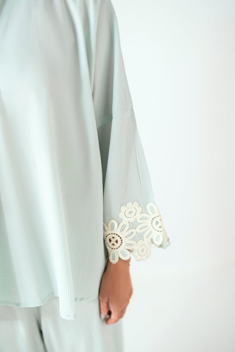 Details: Dyed Co-ord set featuring Shirt Collar with a V-Neckline and Lace on sleeves.