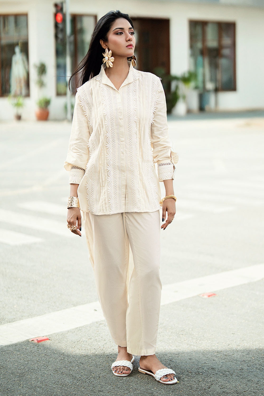 Rooted in quiet craftsmanship, this ripple crinkle co-ord combines tradition with a contemporary finish. The intricate detailing on the front-open shirt gently frames the design, tailored is a comfortably loose fit silhouette. A timeless piece for your casual wardrobe.