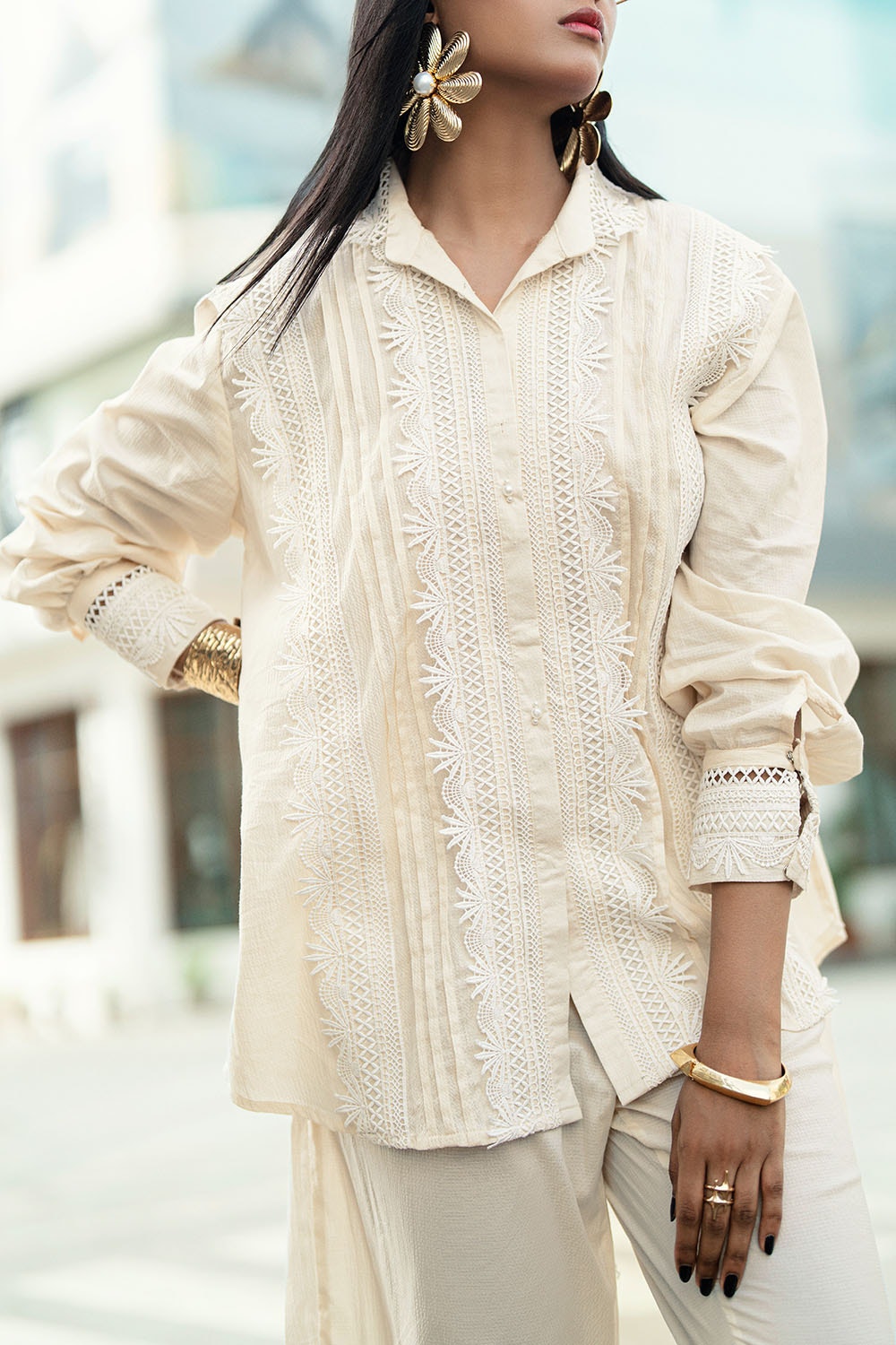 Details: Dyed Co-ord Set featuring Shirt Collar and intricate Lacework